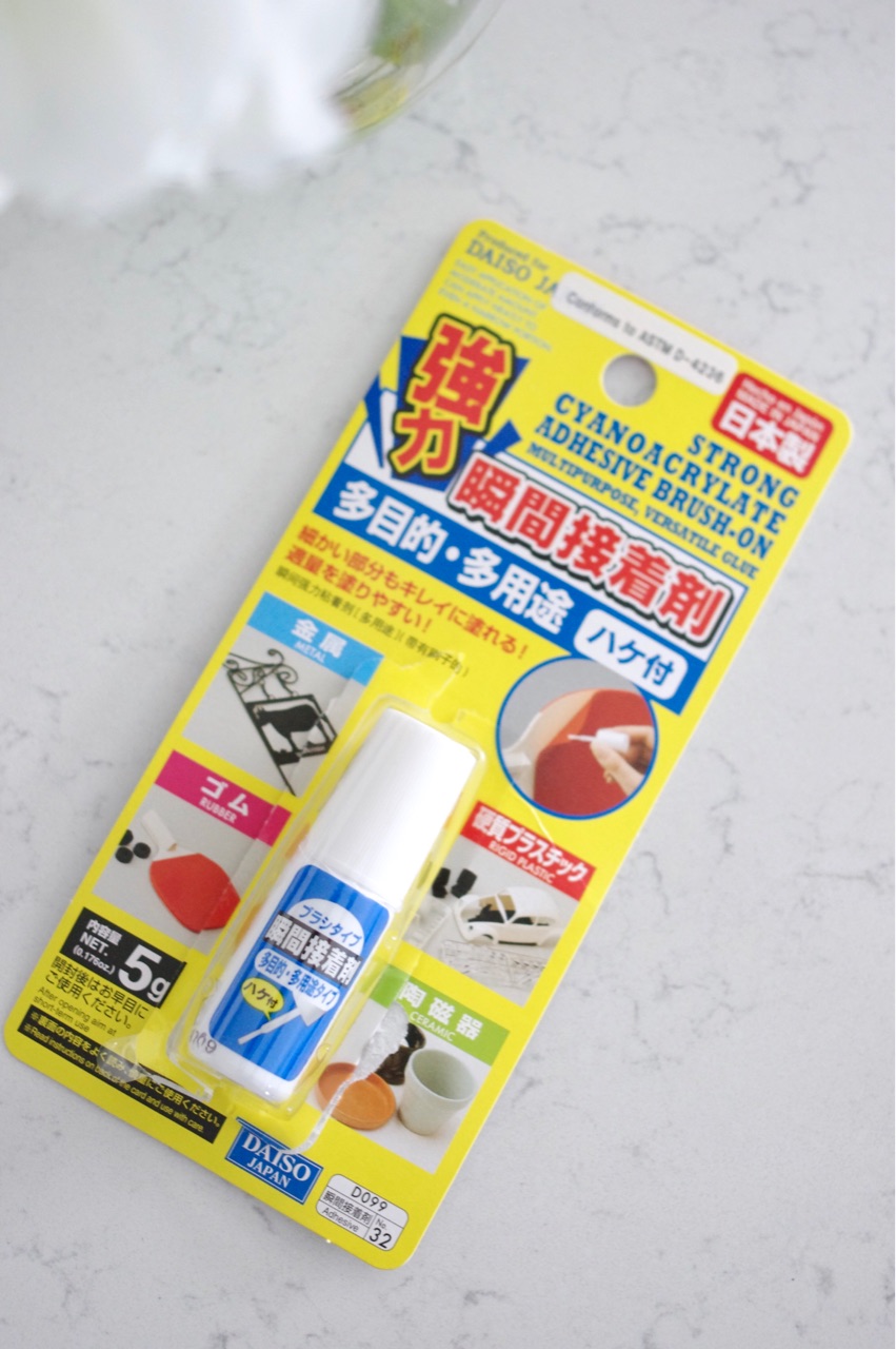 アメリカにも、ネイルグルーは売ってますが、私はダイソーで良いものを見つけたので、これを使ってます↓