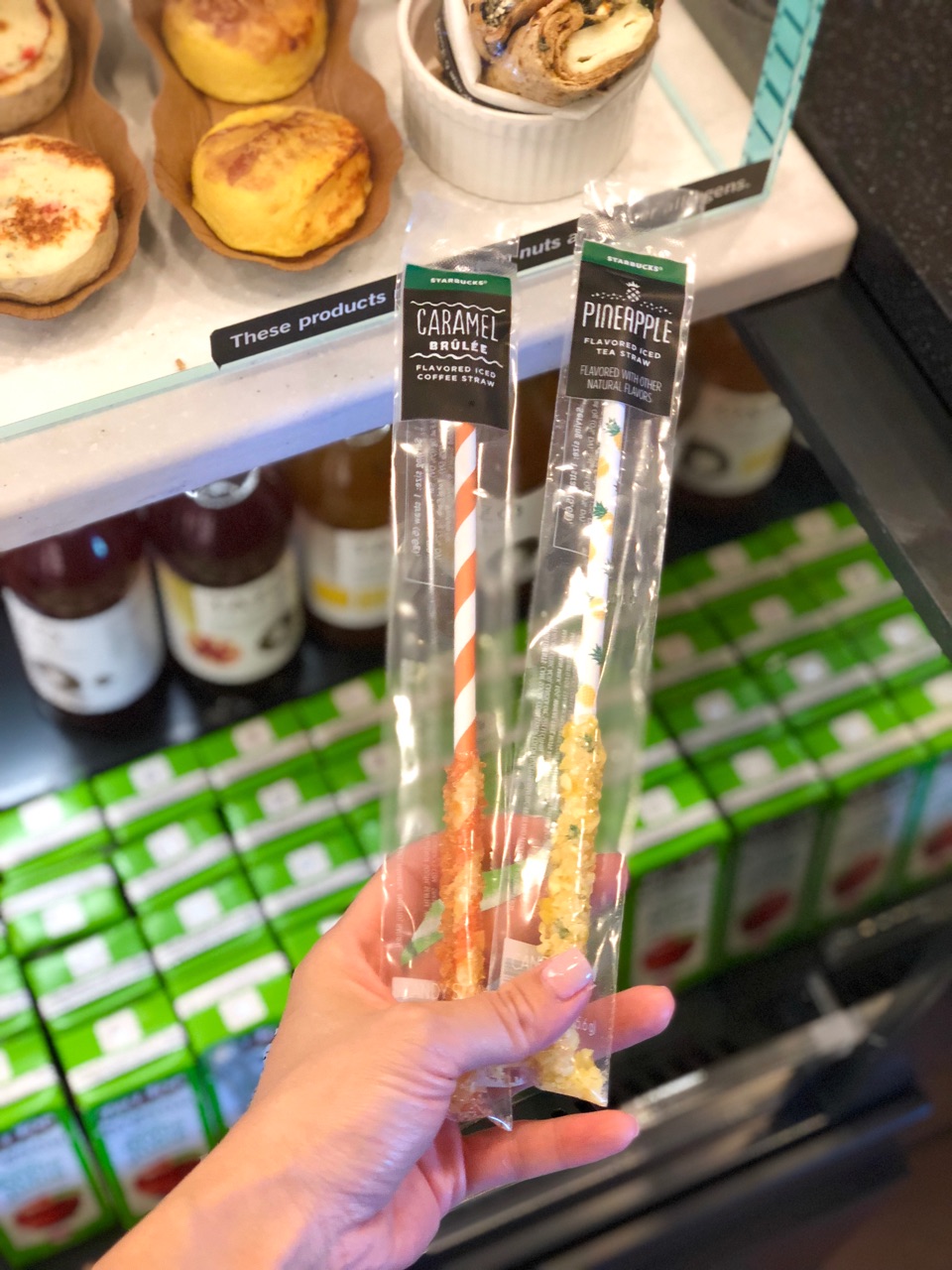 Caramel brulee flavored ice coffee strawとPineapple flavored iced tea straw↓