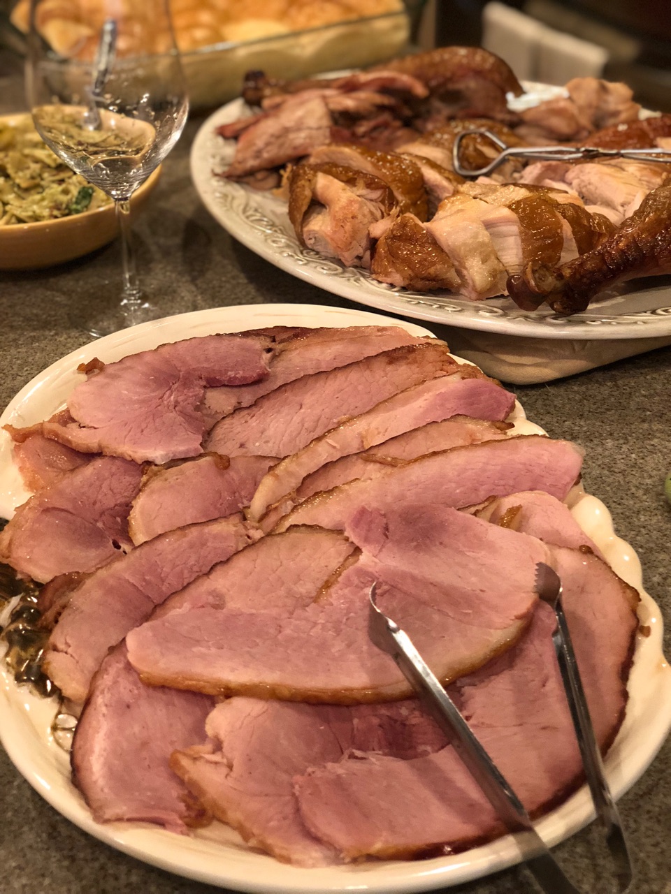 そして、グリーンビーンズキャセロールやマッシュポテト、コーンなどと一緒に頂きます。