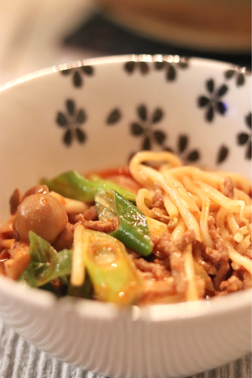 舞茸、ぶなしめじ、シメジ、モヤシ、長ネギ、生麺… アジアンスーパーに行く時間がなかったので、近くのスーパーで手に入れたものだけです