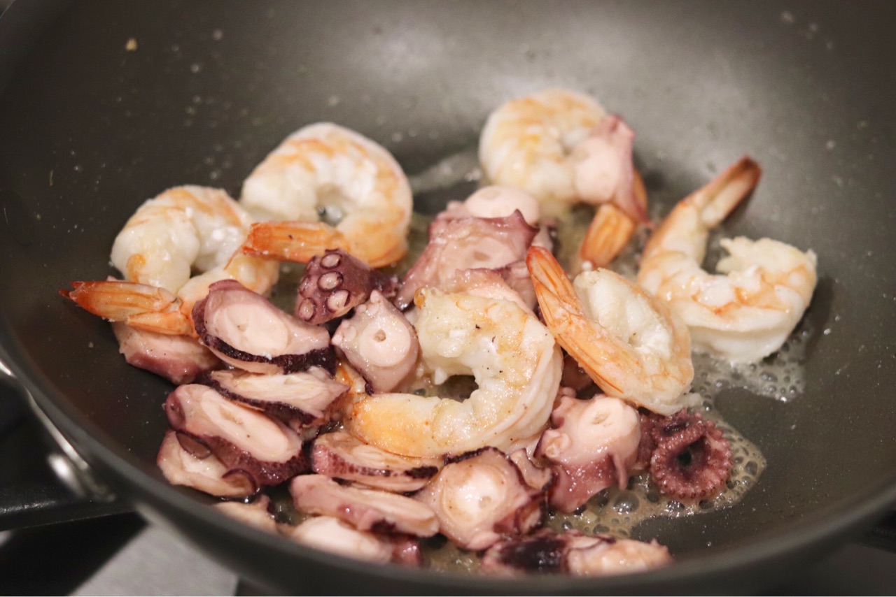 フライパンにオリーブオイルとガーリックを入れ、先程のタコとエビで炒め…