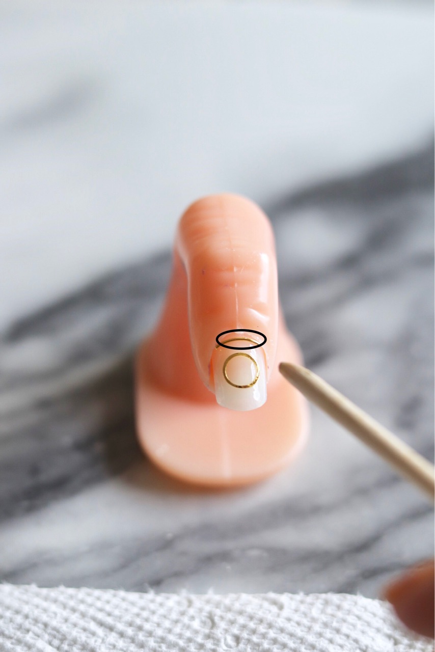 薬指にはワイヤーを爪の生え際に置いて、ワイヤーパーツの中にべっ甲の色と柄を描いてみました。