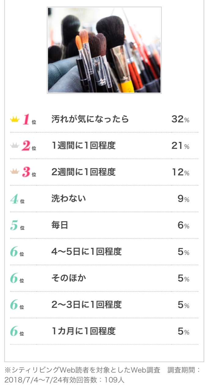 ブラシやスポンジを洗う頻度について、シティリビングが109人にweb調査した所、こんな結果になったそうです↓