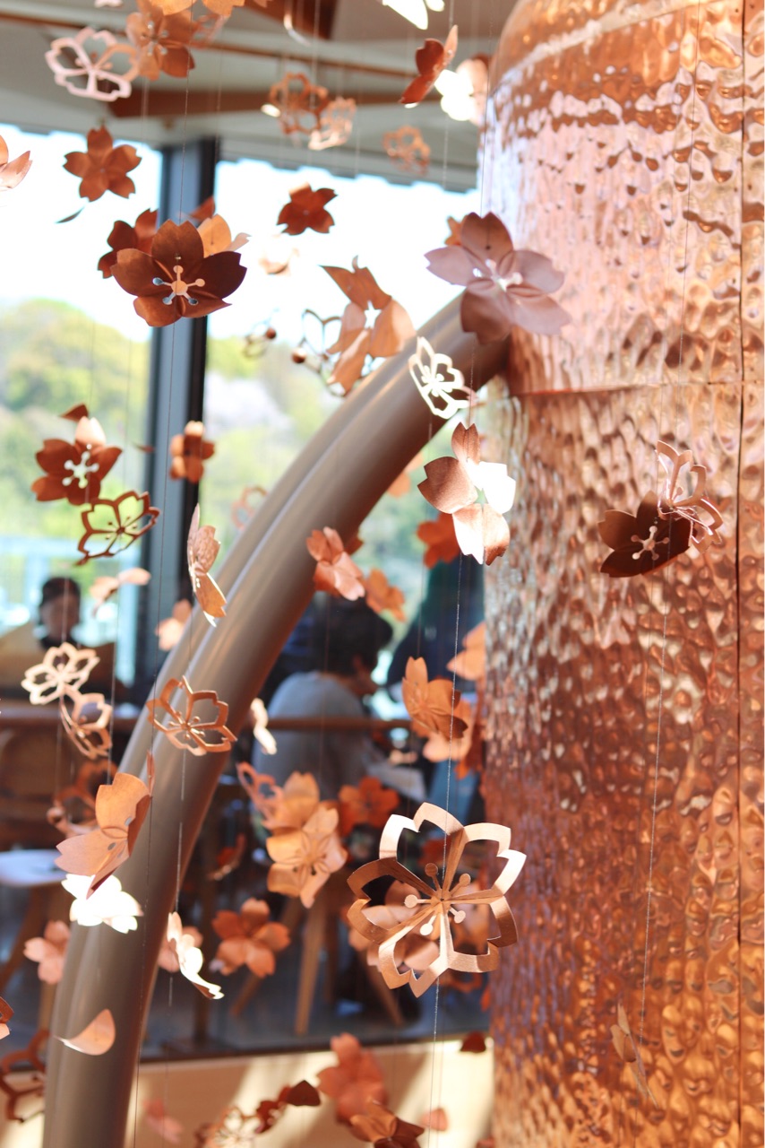 4階まで届く、高さ約17メートルの赤みを帯びた銅板のキャスクの表面には、職人が一枚一枚手作業で仕上げた桜の花びらが飾られていました。