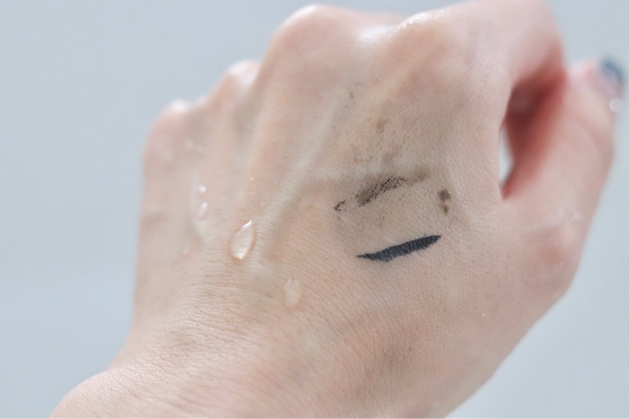 日本はフィルム処方のコスメが多いので、これぐらいは普通かもしれませんが、水に濡らした後の線を指で何度も強く擦っても、全く消えないんです↓
