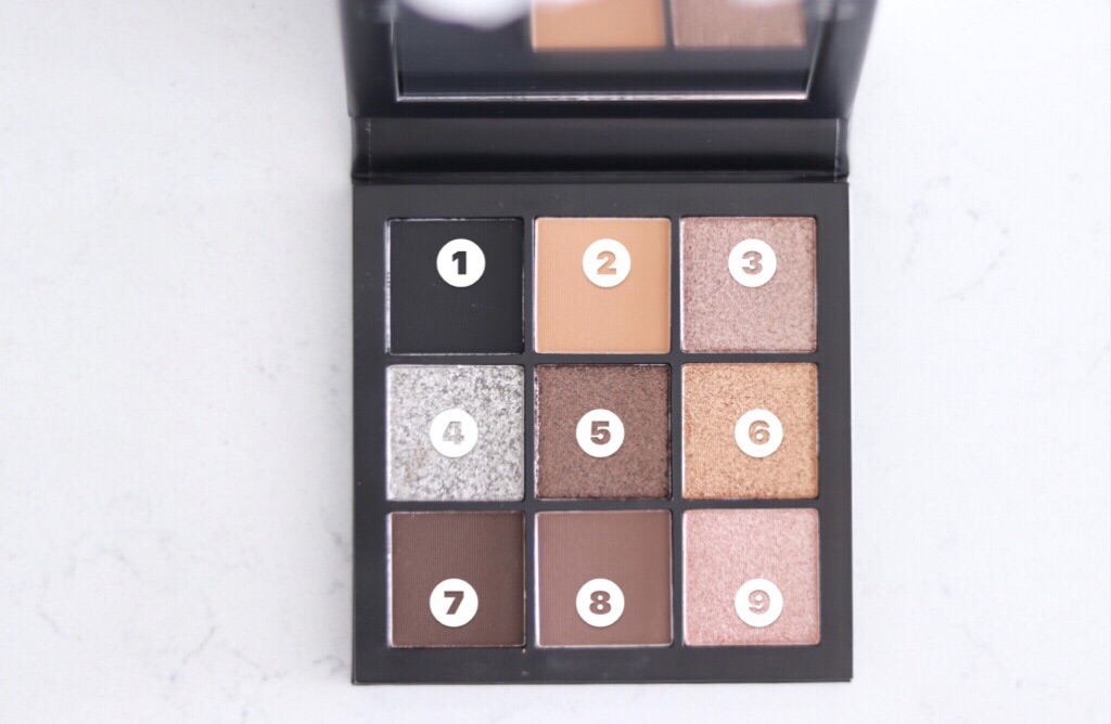 ベース用のベージュ(マット)、4色がシマー、1色シルバーのラメ、そして3色がブラウン系とブラックのマットなので、アイライン付近に使えます↓
