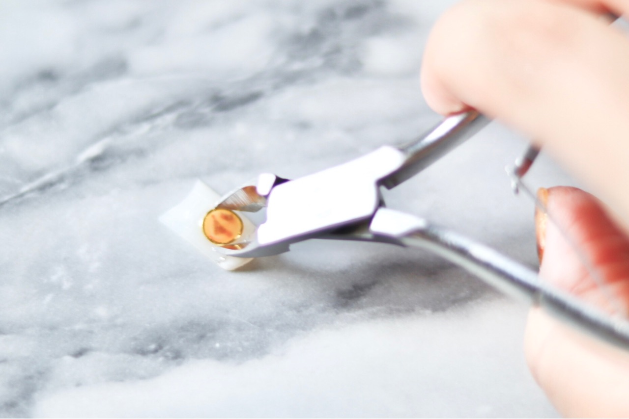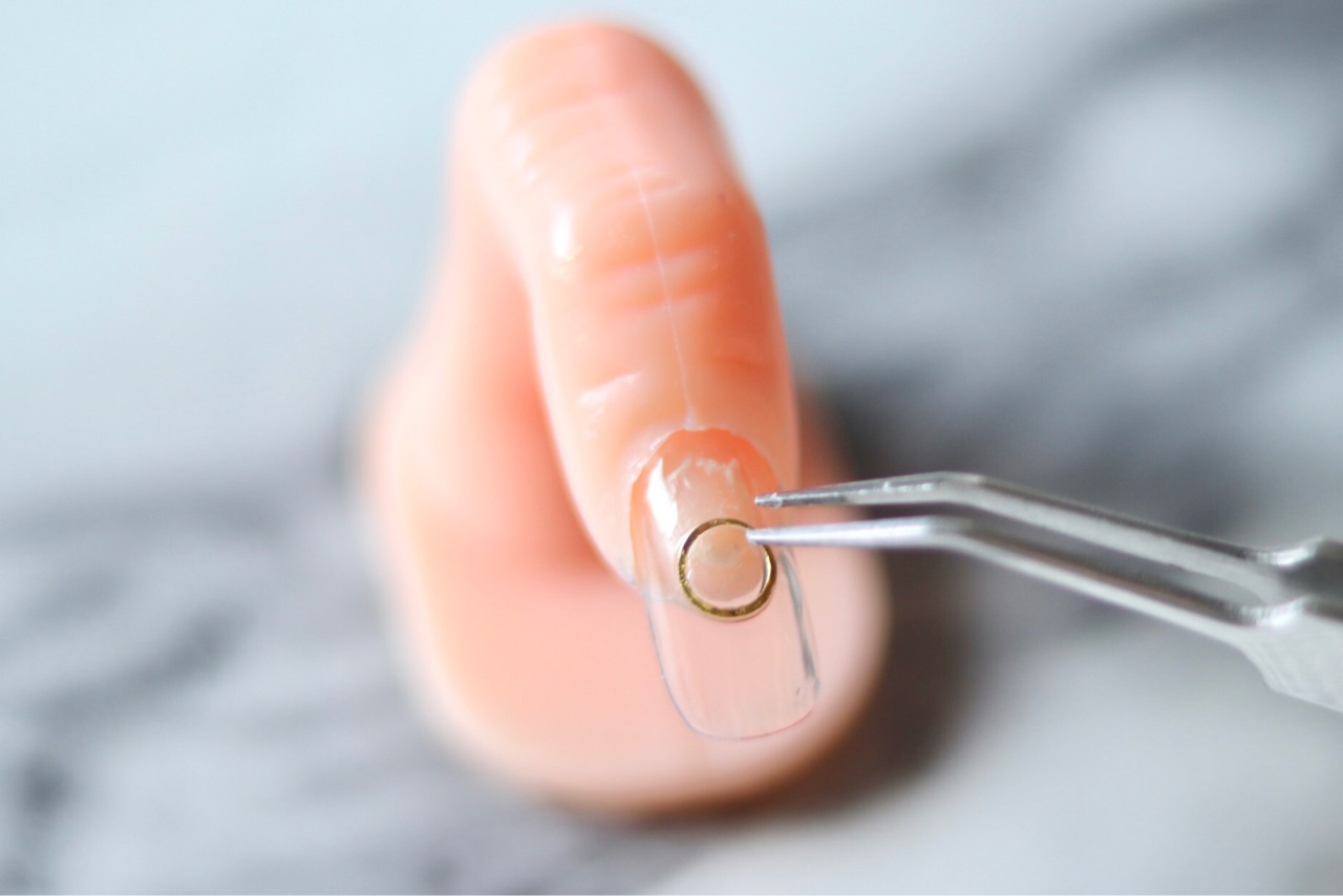 爪はカーブしているので、平らなメタルパーツをネイルに置くときは、爪のカーブに合わせてパーツにもカーブをつけます。