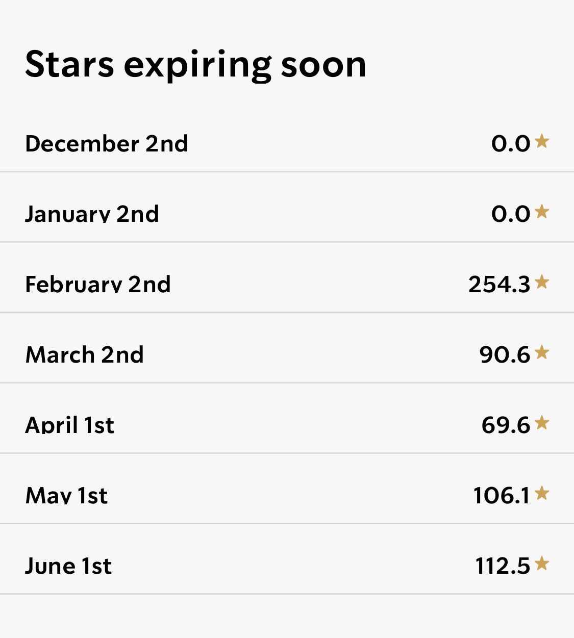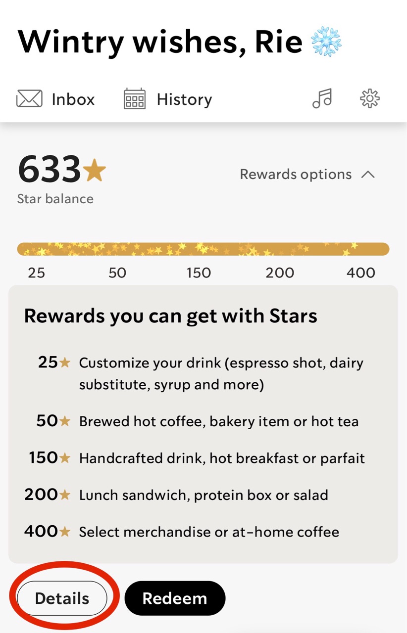 アプリの”details”をクリックすると、スター(ポイント)の期限がいつ切れるか見れるので、スターが消える前にredeemするのを忘れずに