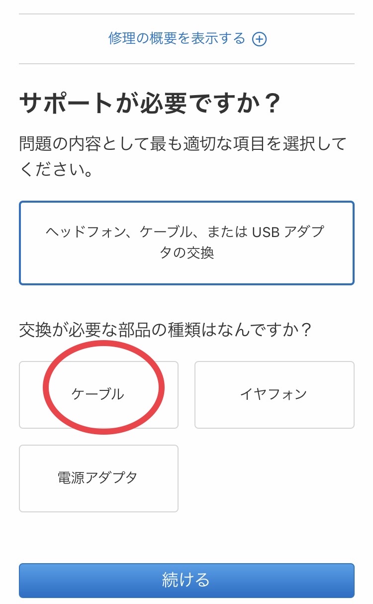 交換の部品の種類は何か聞かれるので、”ケーブル”を選び...↓