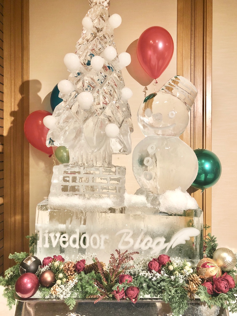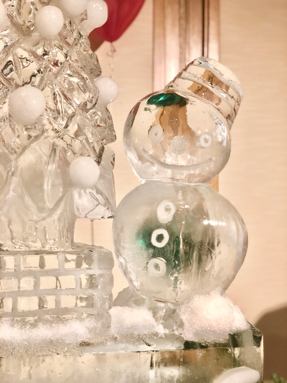 アイスで作られた、ツリーと雪だるま↓