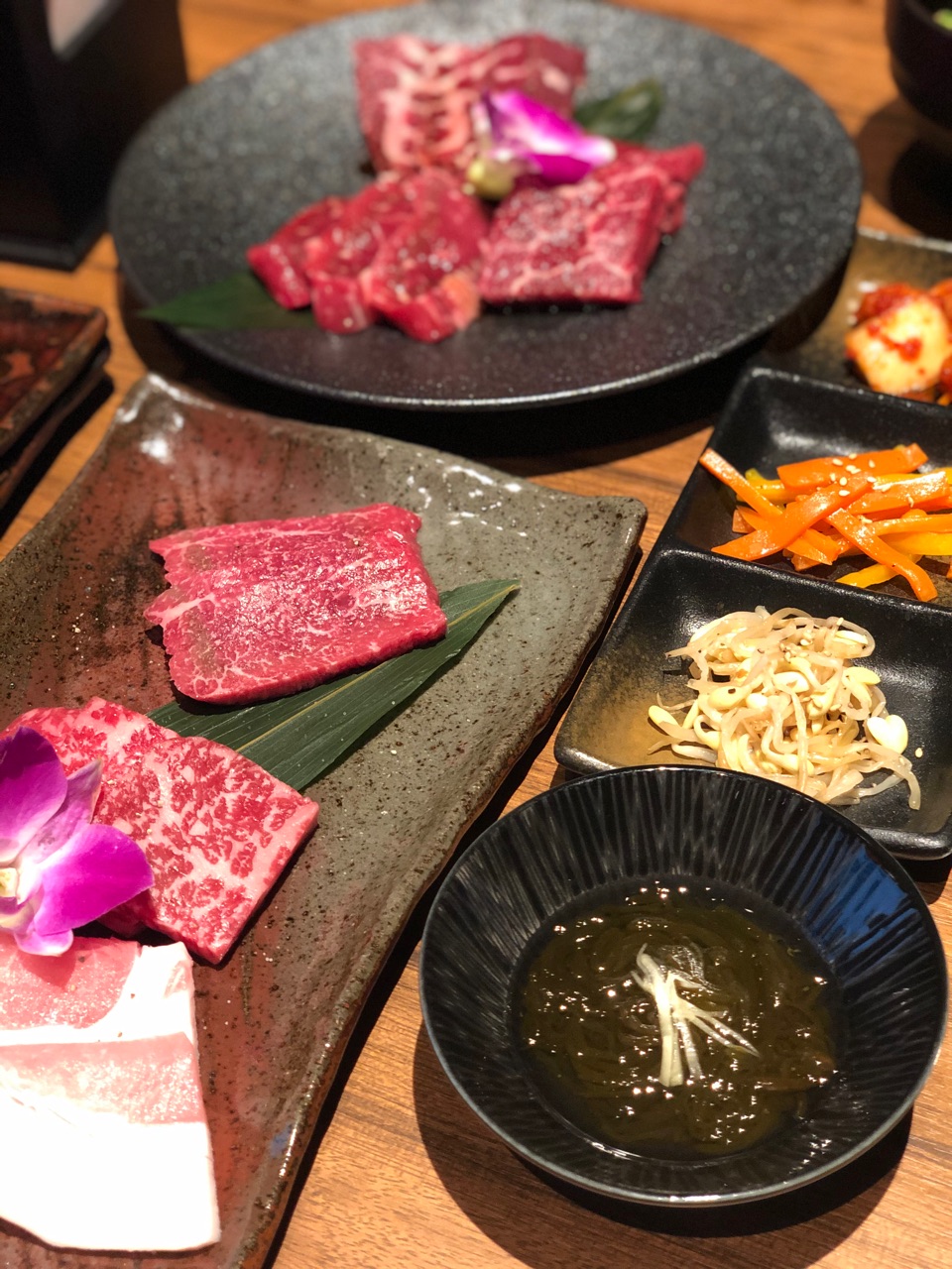 黒毛和牛カルビ、黒毛和牛赤身肉、あぐーロース、ナムル+キムチ、サラダ、ご飯、スープ、デザートのセットを頂きました。
