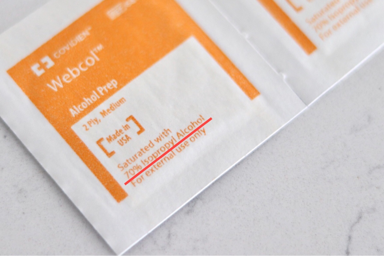 アメリカの薬局で売られている、注射を打つ時や傷を消毒する時に使う消毒ワイプにも...↓