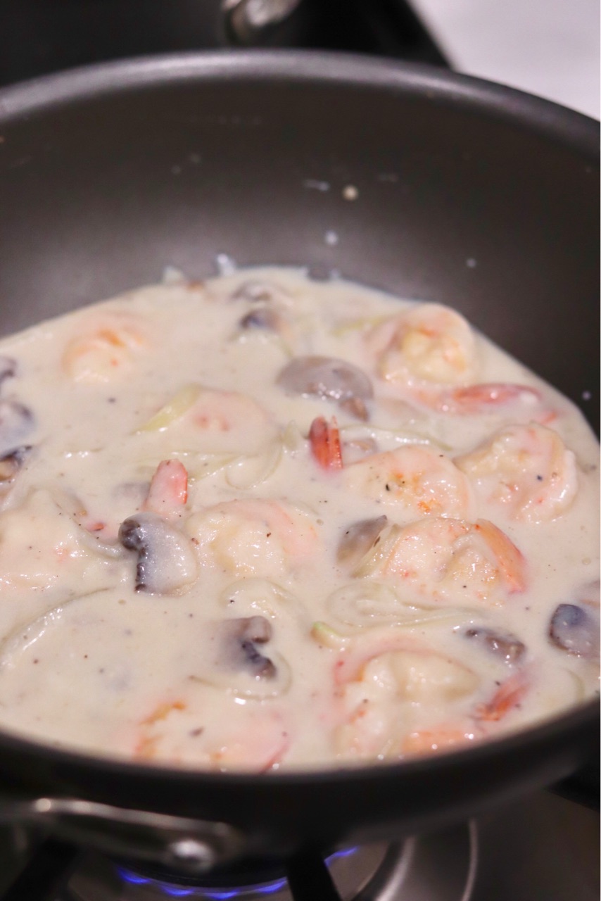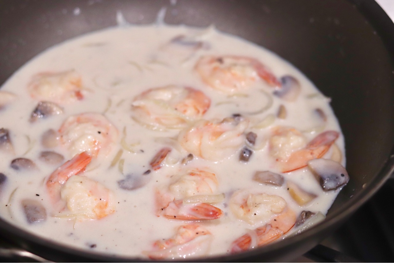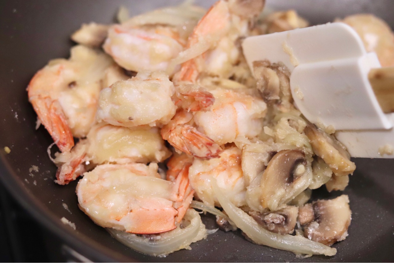 私が使用した材料は、玉ねぎ、マッシュルーム、エビ↓