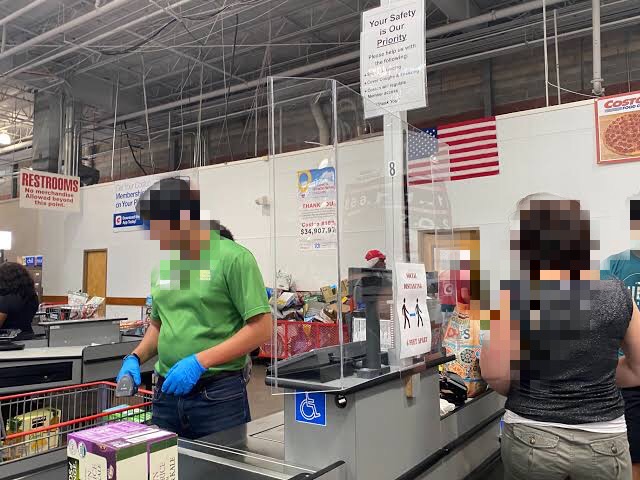 アメリカの多くのスーパー等のキャッシャーでは、現在Plexiglass(アクリル樹脂プラスチックのボード)がインストールされ、キャッシャーの人たちを守る様プロテクトされています↓