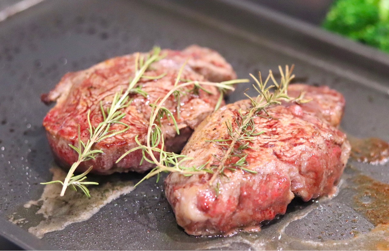 ジャスティンが最初はキャストアイロンの上で軽く焼き目をつけて、ローズマリーと一緒にオーブンで7分間焼いてくれました↓