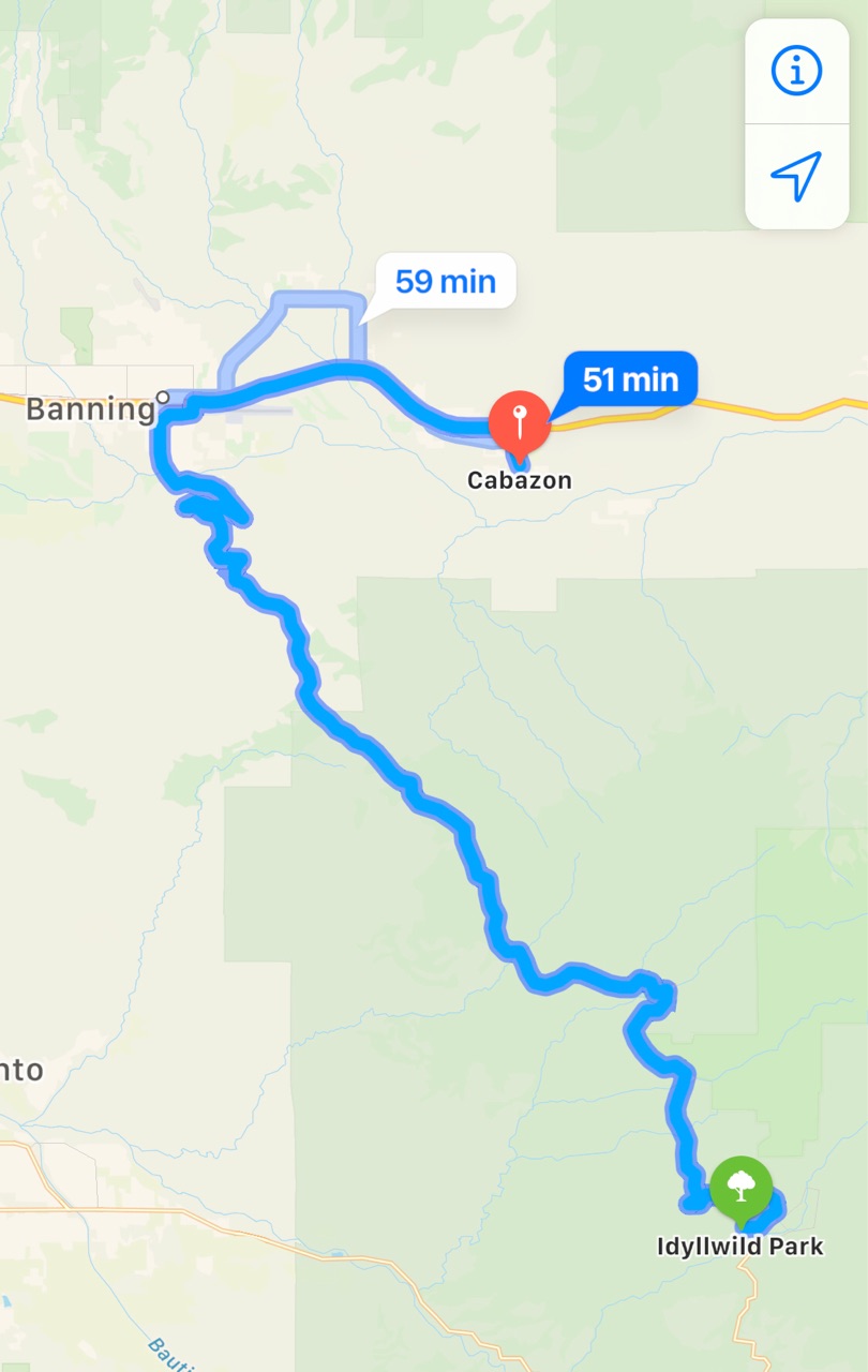 当日は、朝5時半に家を出発し、11時頃カリフォルニアのCabazonという街のDesert Hillsのアウトレットモールに到着し、数時間ショッピングを楽しんでから、今回予約を取ったキャビンがある、Idyllwildへ。