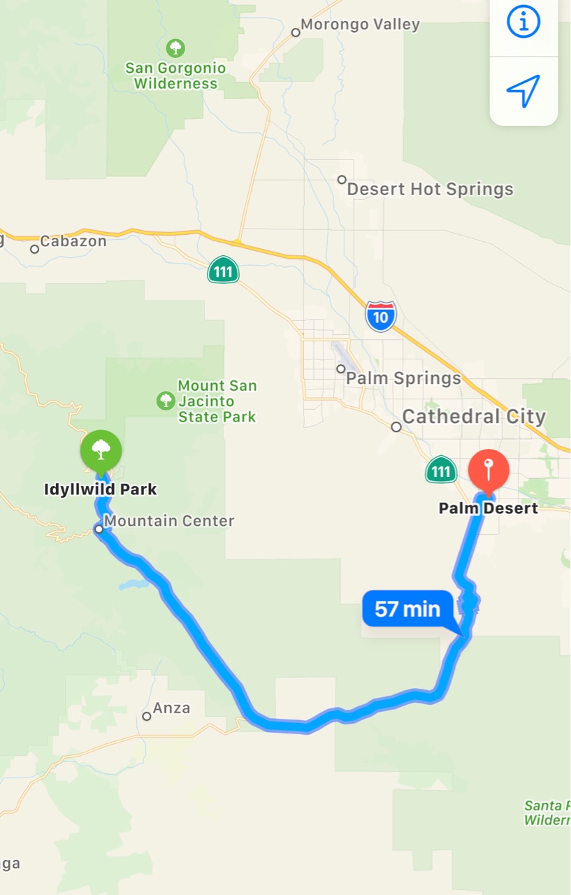 アリゾナ方面からだと、Cabazonより手前のPalm DesertからでもIdyllwild方面に行ける道があり、先程の行き方より遠回りになりますが、こちらのほうがカーブが少ない様で...↓