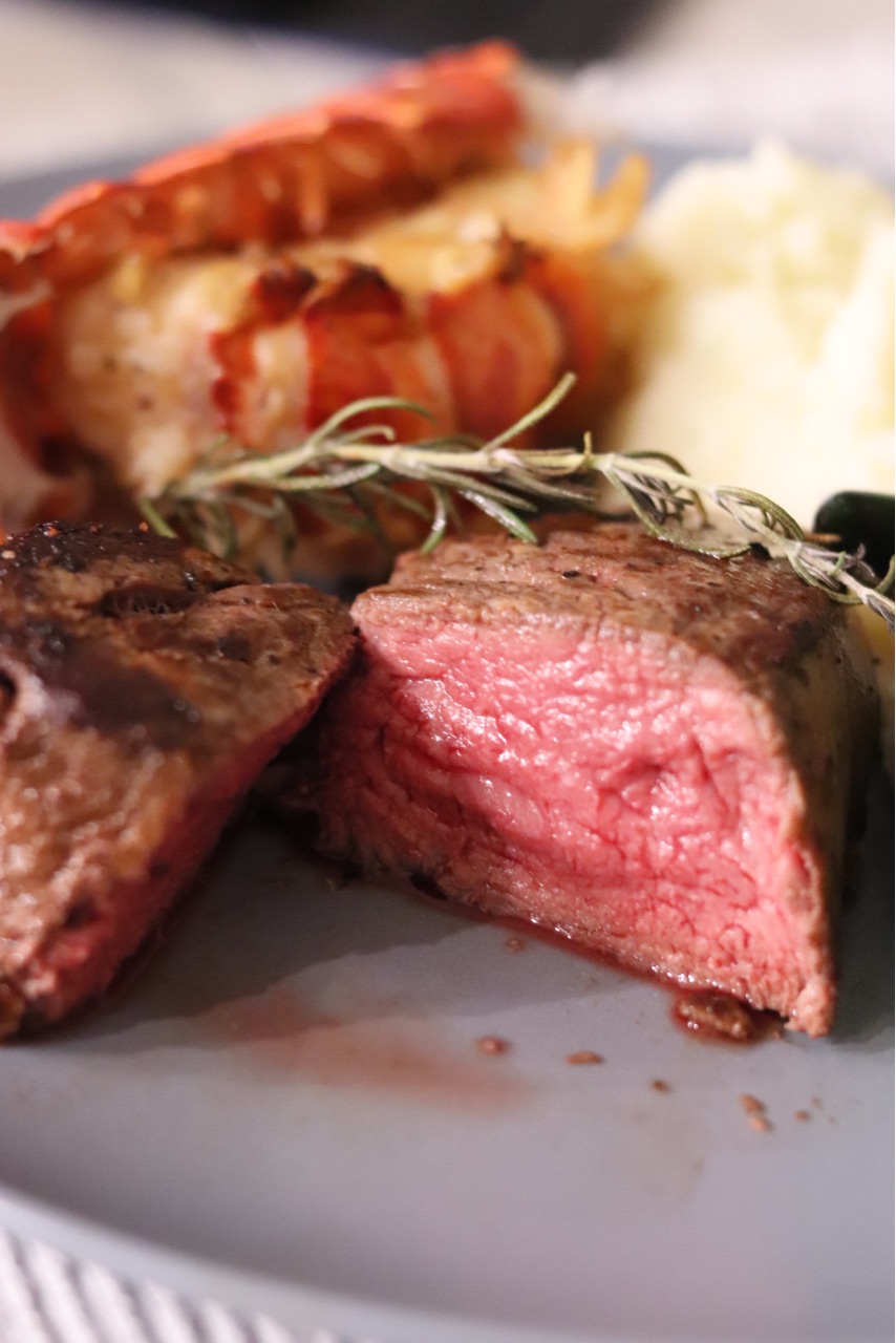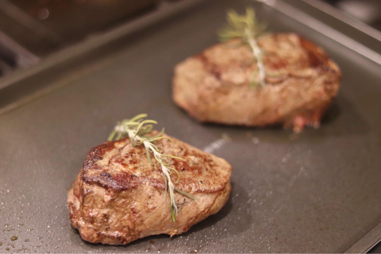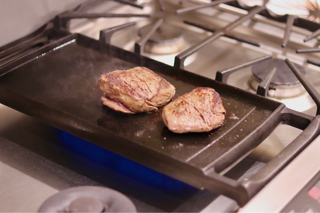 Costcoのフィレミニョンをキャストアイロンで焼き目を付けて↑...