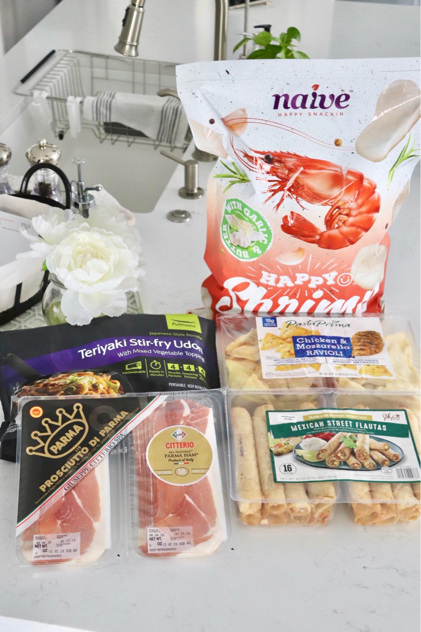 いつもの生ハムとうどん、ジャスティンが食べたいと言って買っていた、週末用のラヴィオリとメキシカンのTaquito(タコスをロールにしたもの。