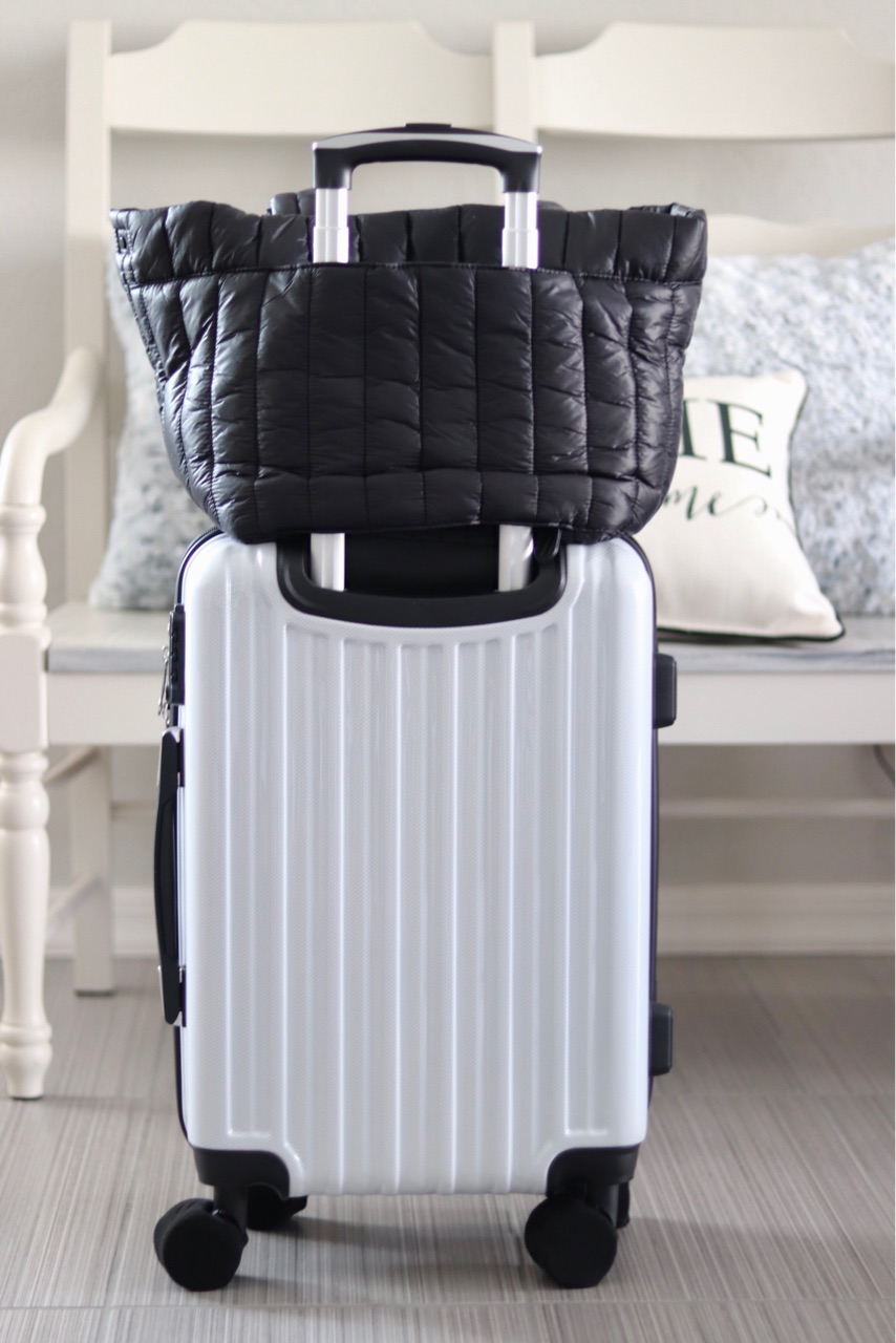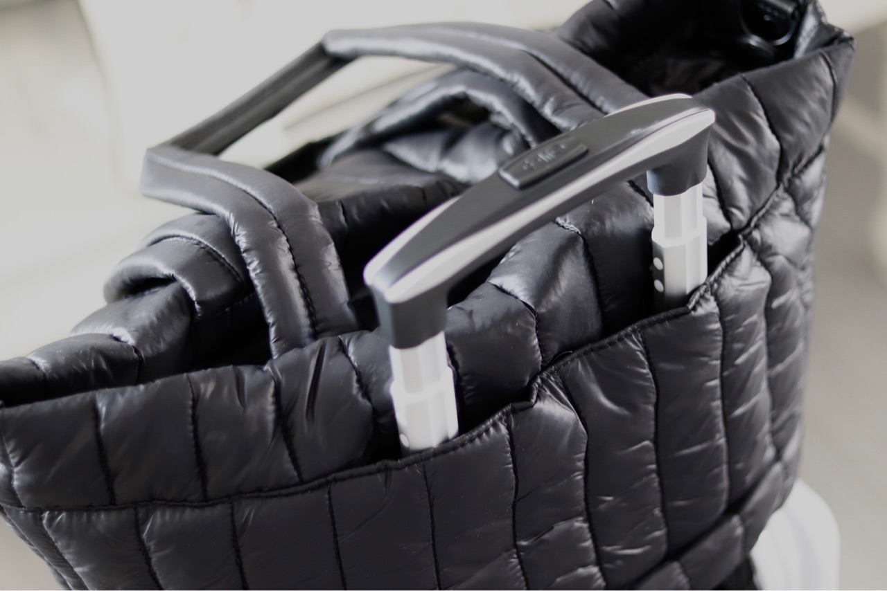 ジッパーを開ける事で、スーツケースの持ち手にスライドし、上に乗せる事ができるんです↓