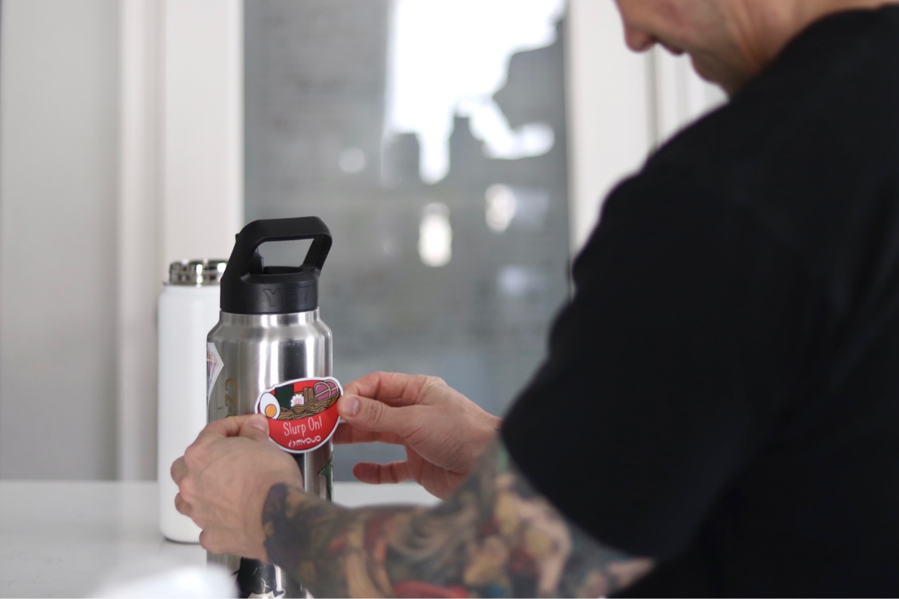 ラーメンステッカーを、喜んでジム用のYETIの水筒に貼る、夫ジャスティン...笑↓