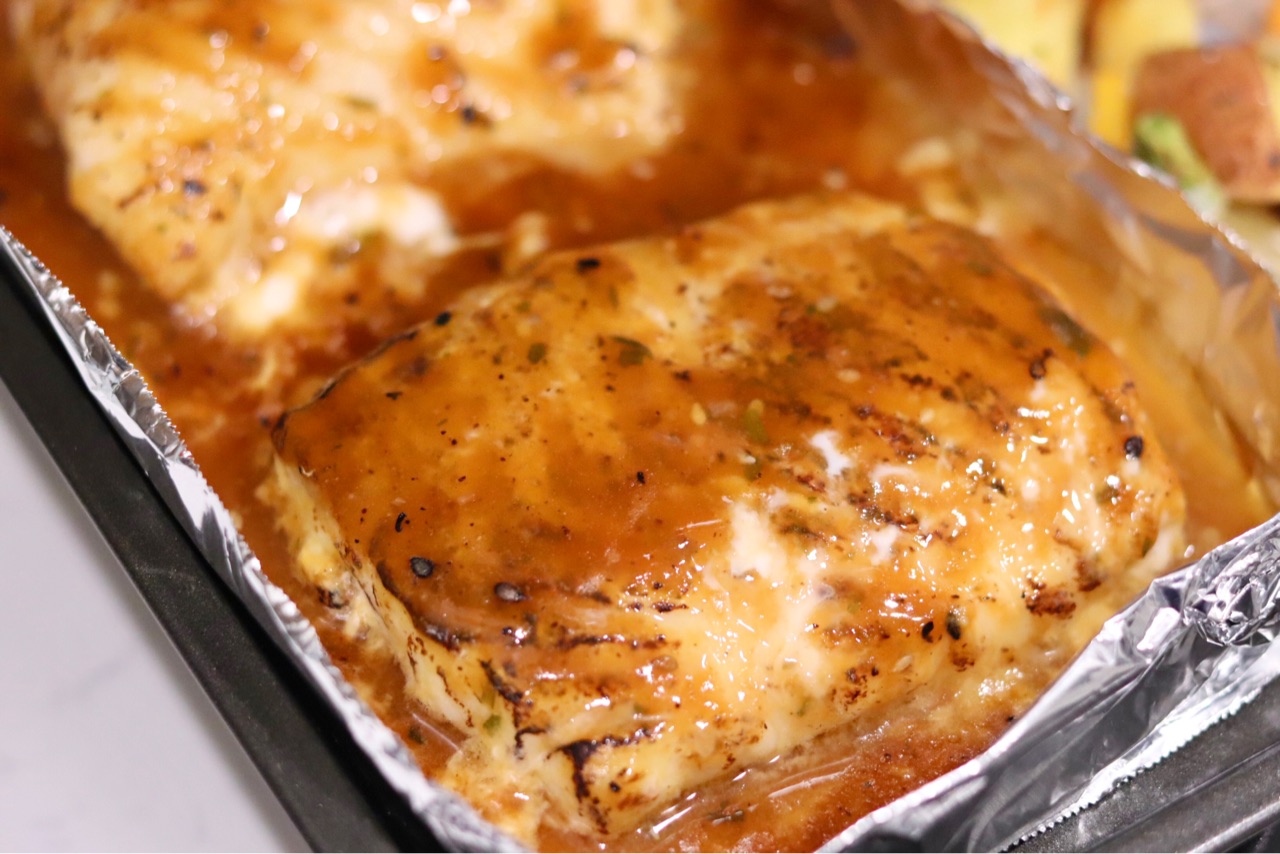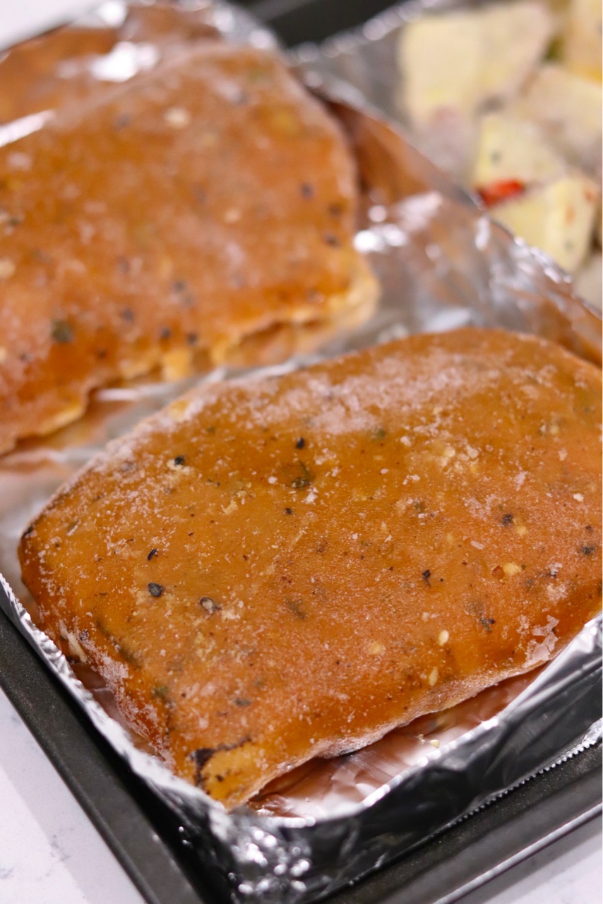 ソース付きの冷凍されている魚は、大きめのトレイや耐熱皿の上でオーブンに入れると、液が溶けて広がり焦げつく恐れがあるので、小さめの耐熱皿、またはアルミフォイルで囲ってオーブンで焼くと良いかと思います↓