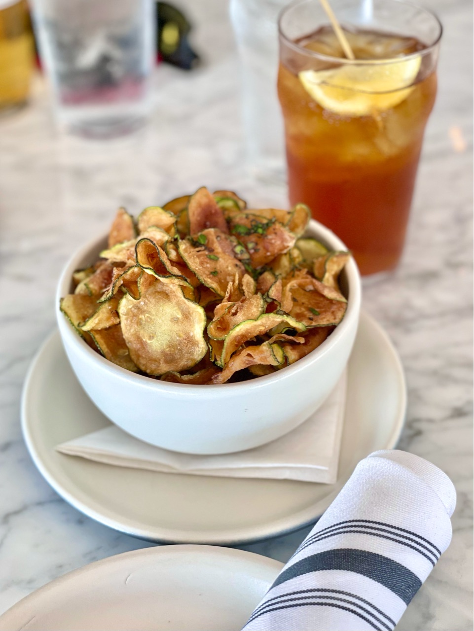 アペタイザーにズッキーニのチップスをオーダーしました(Happy Hourのメニューだったので、$5!)↓