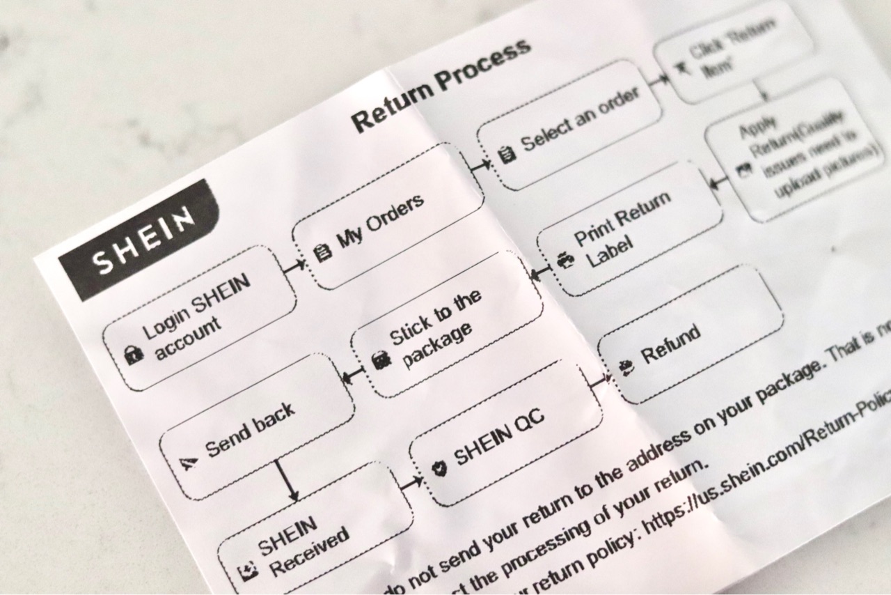 SHEINの自分のアカウントから、”My order”→”Return item”へ行き、リターンアイテムに☑︎し、当てはまる返品理由に☑︎、返品ラベルをプリントアウト→送り返すだけ。