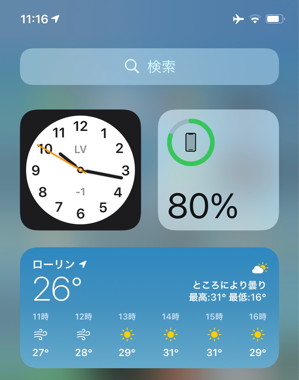 気温の所↑には、この時の現在地の気温が書かれていますが、iPhoneの日本語だと町の名前が”ローリン”になっていますね。笑