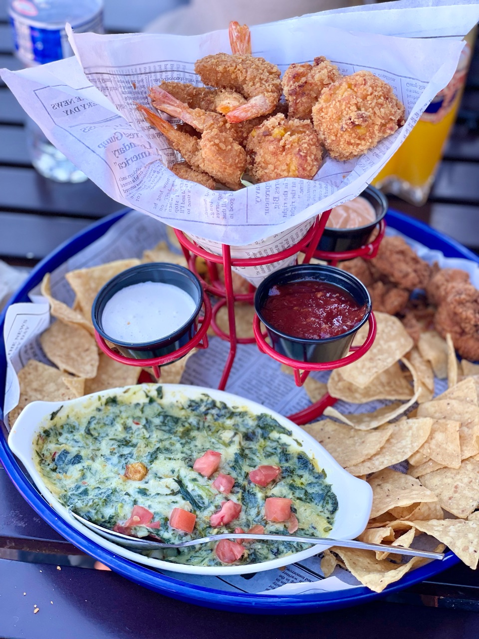 サンプラーをオーダーしたら、スピナッチグラタンやらエビやチキンのフライが来ました。