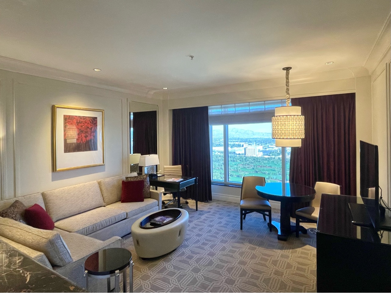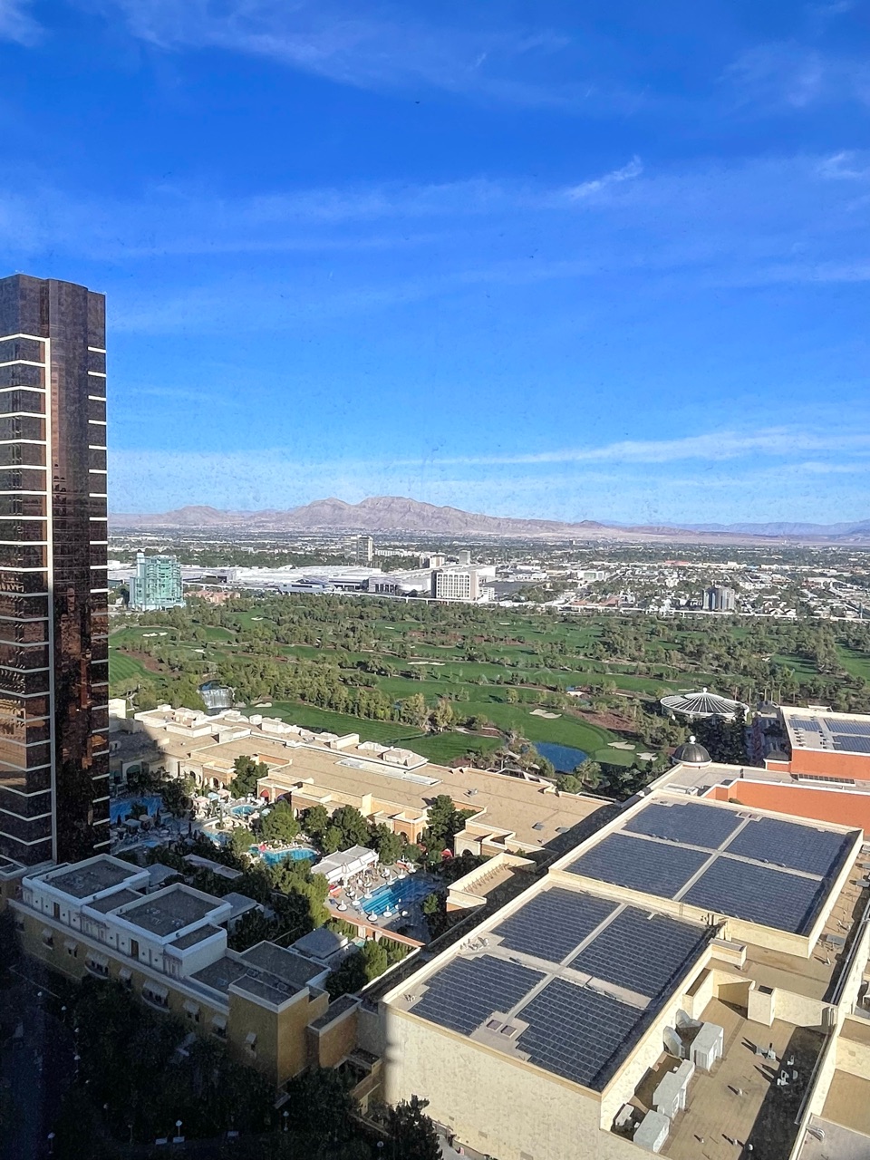 私たちが滞在したのは32階で、隣のWynn Las Vegas Hotelのゴルフコースが見えます↓