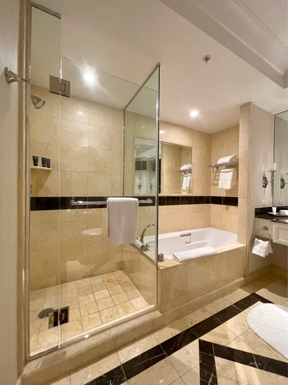 ベネチアンの部屋は650 sqfft(約60m2)で、バスルームの広さはパラッツォと同じ130 sqft(12m2)でしたが...