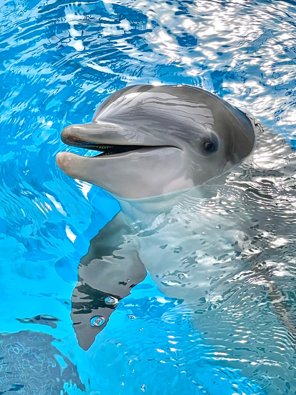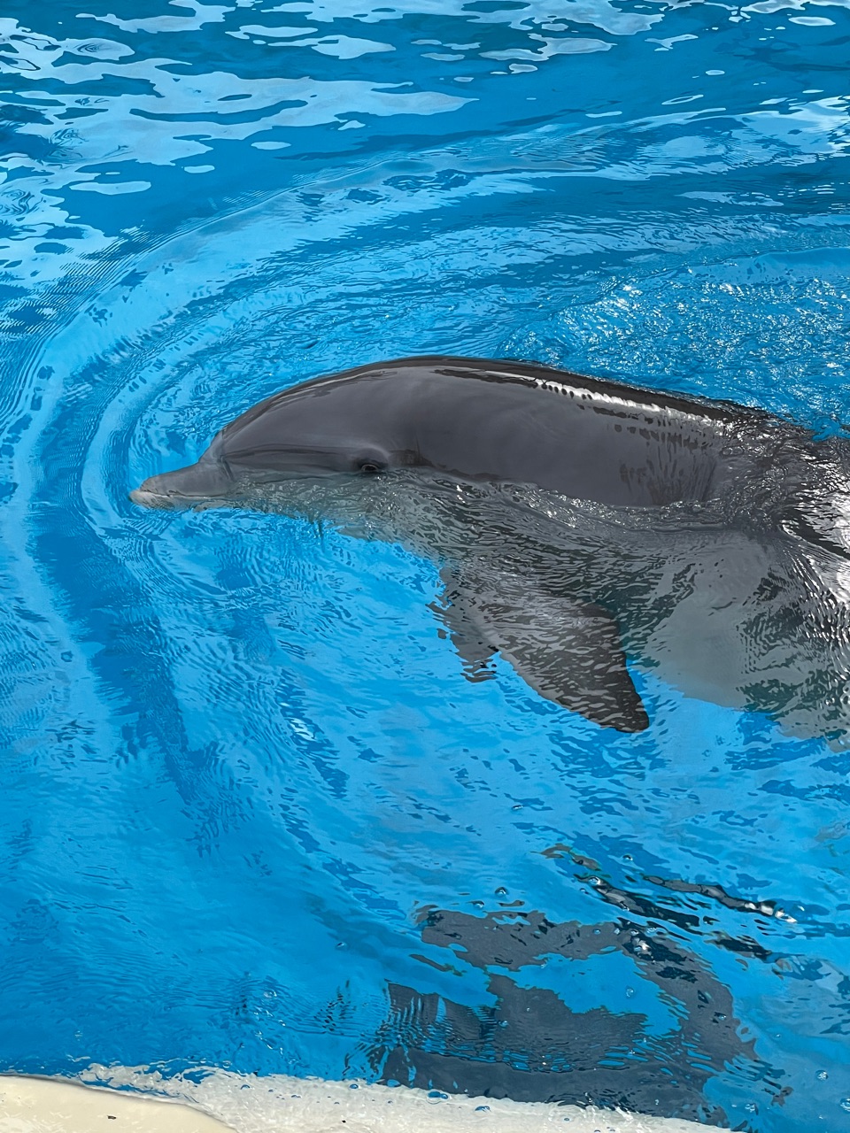 この時はまだショーが始まっていなかったのですが、夫が売店でビールを購入している間ひとりぼっちでいたら、イルカが挨拶しに来てくれました♪