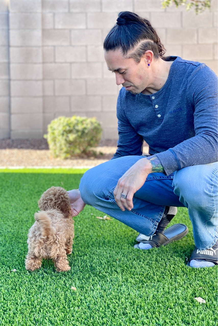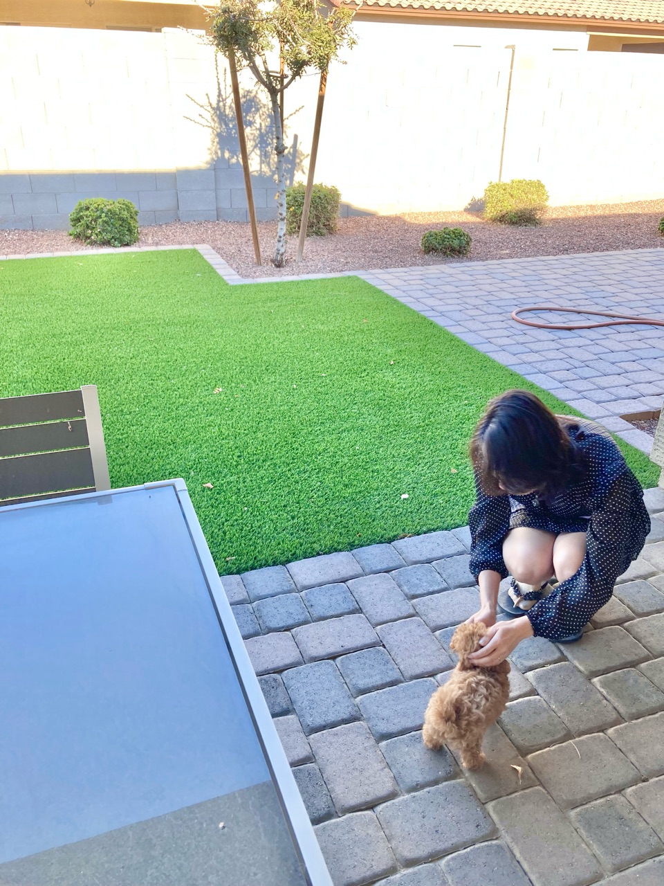 家に到着後は、速攻バックヤードに連れて行き、芝生の上を歩かせると、普通に用を足しました。