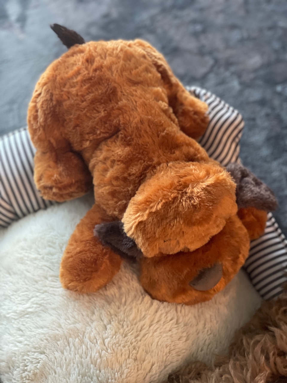 このぬいぐるみには母親の匂いがしみ付いているので、「1、2週間は洗わないで」と、ブリーダーさんに言われました。