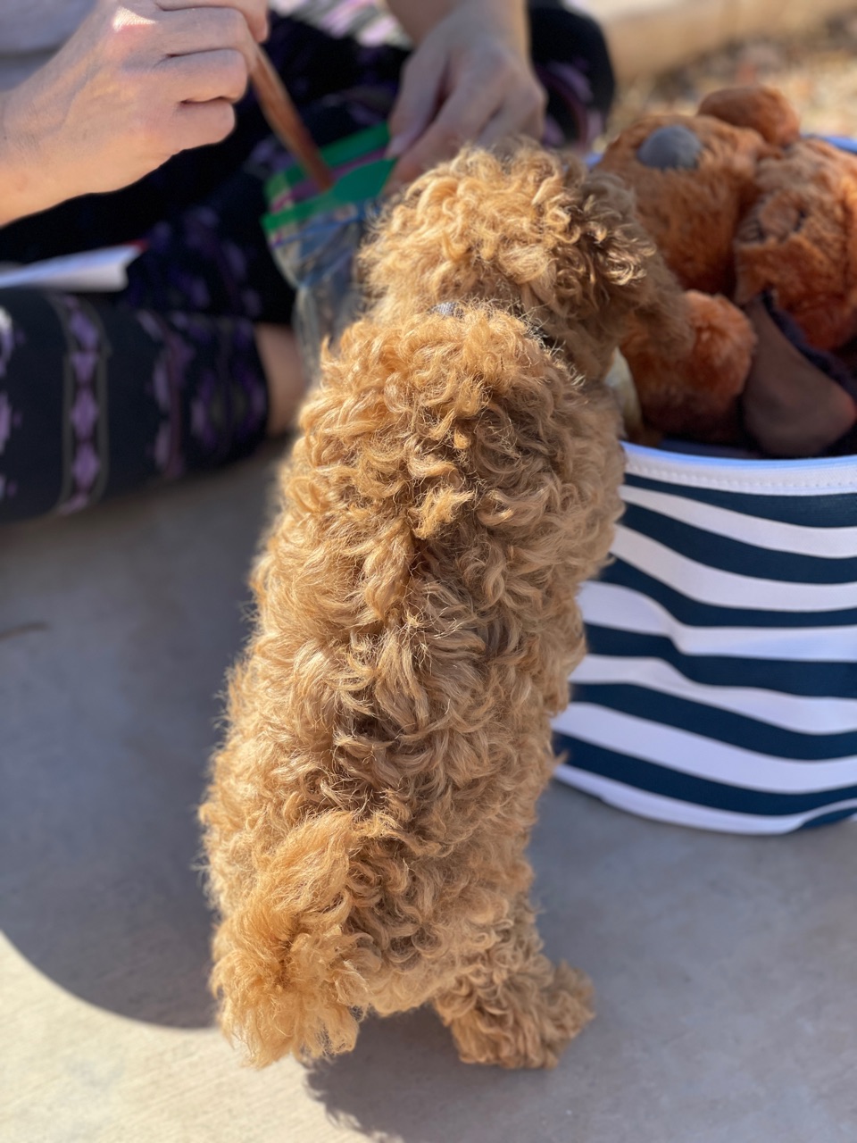 上の写真のバスケットの中には、ブリーダーさんが準備してくださった1週間分の食事、トリートや豚の耳🐷、おもちゃ色々、ブラシなどなどのセットが入っています↑