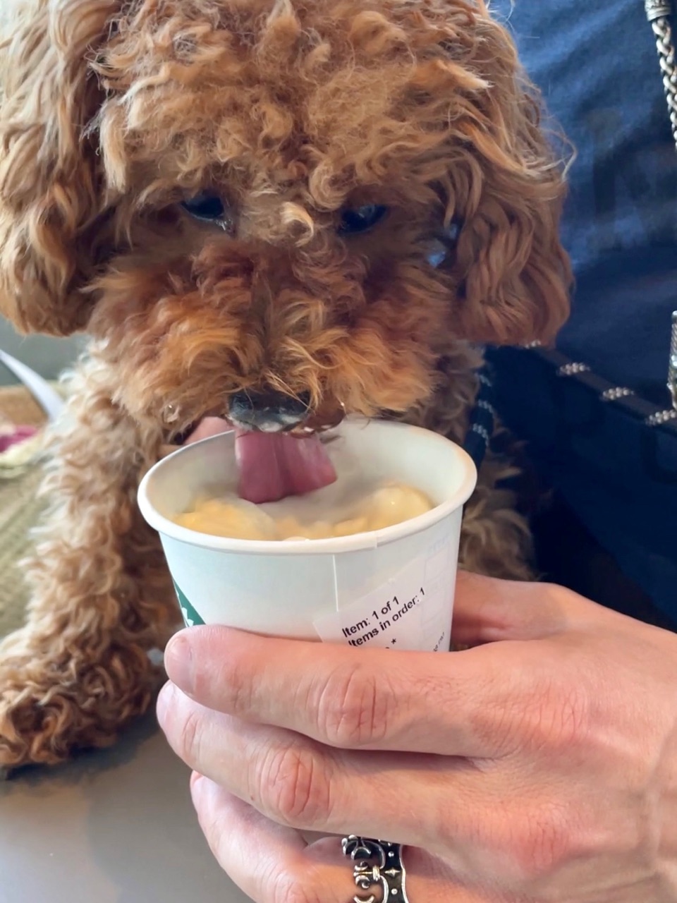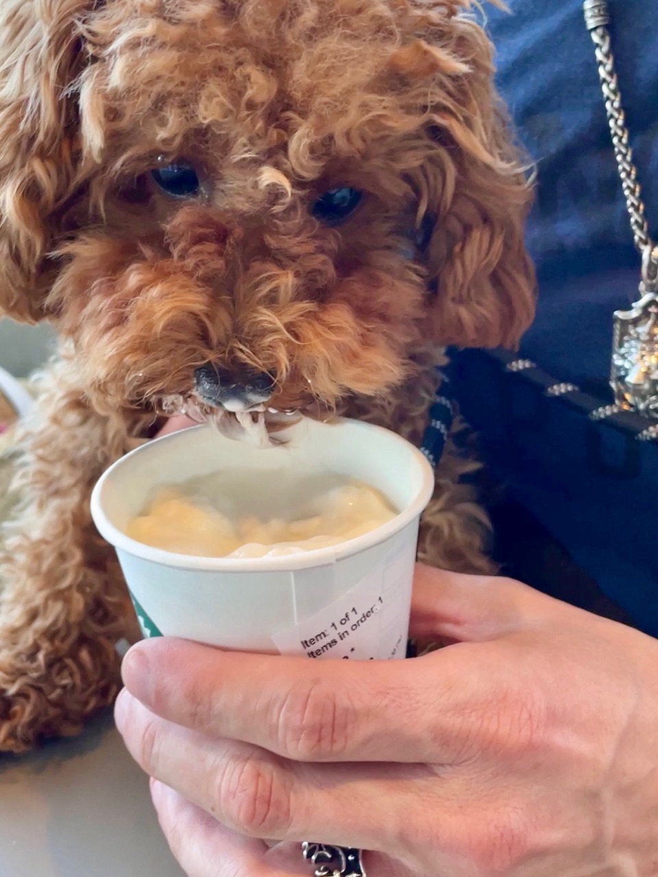 愛犬ダフィーには、シュガー系のものはまだ与えた事がないのですが、旅行中は特別という事で、私のドリンクを購入する際に一緒に注文してみました。