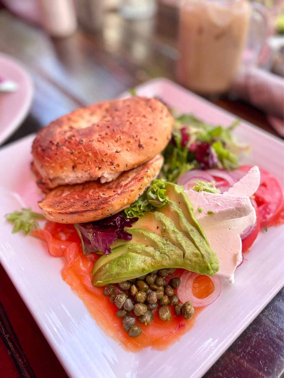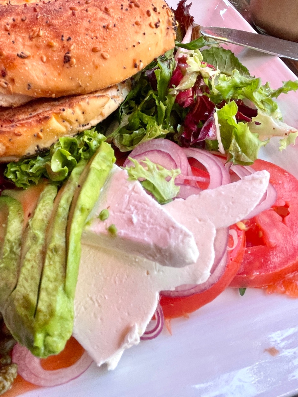 スモークサーモン、クリームチーズ、アボカド、レッドオニオンが、Open Facedになっているベーグルサンド。