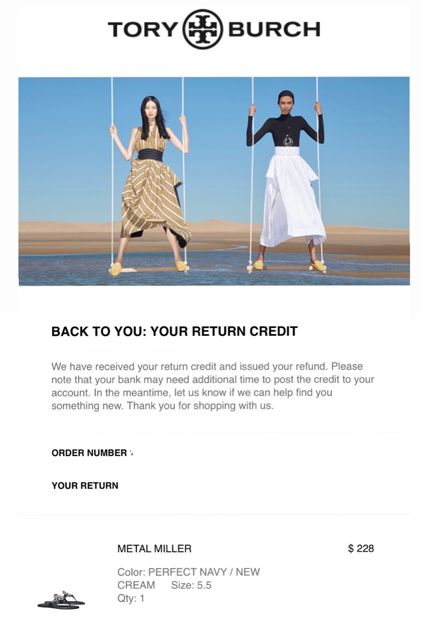 そして、Tory Burchから商品を送り返すためのラベルがemailで送られてきて、次の日にトリーバーチのウェアハウスに送り返しました。