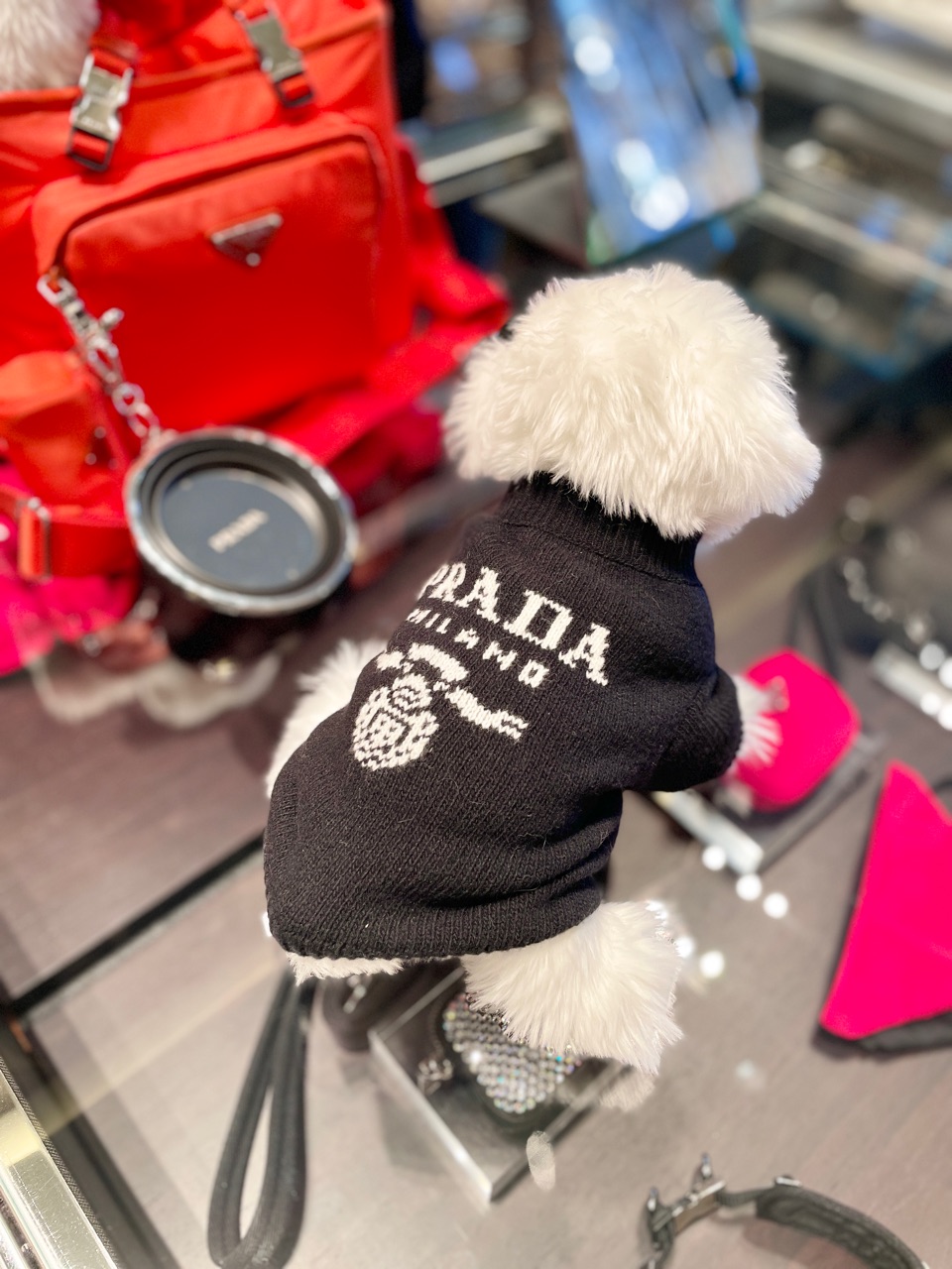 プラダの店内は、既に年配のご夫婦がいて(セールスアシスタントが必ずつきます)、ミディアムサイズのプードルをお連れのカップルでした🐩