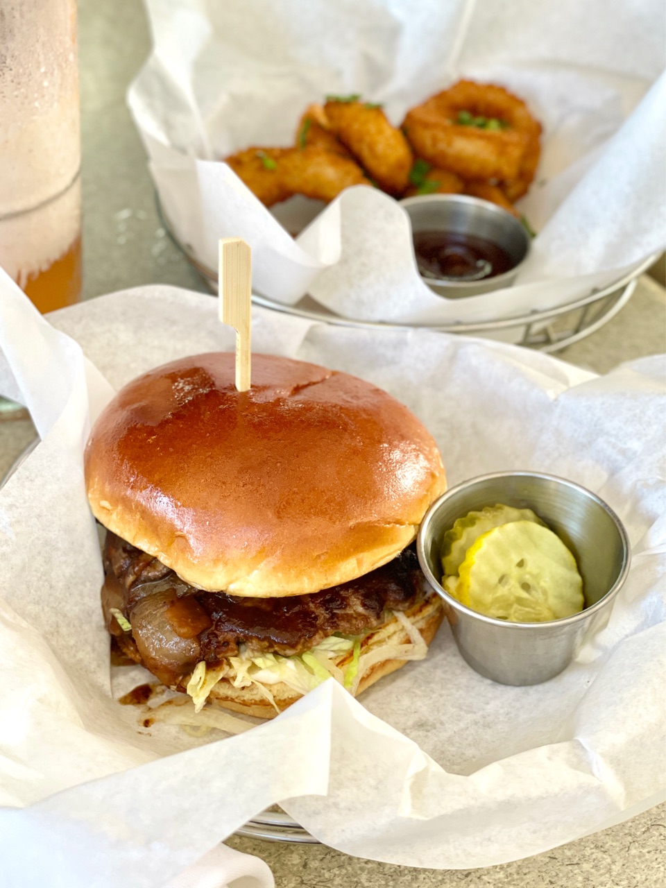 バーガーは$6、サイドのオニオンリングは$4、オレンジフロートは$2の激安!