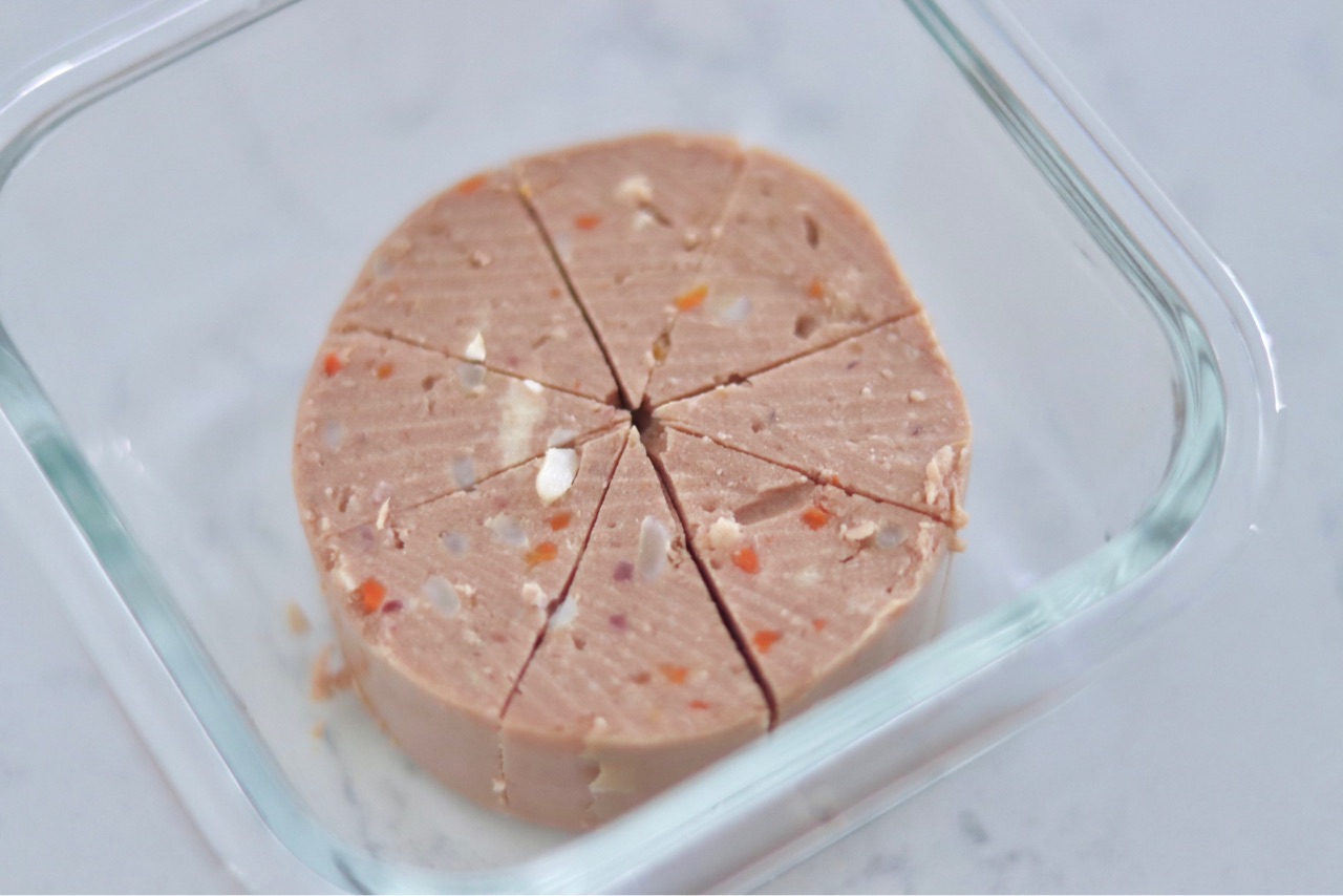 私が購入しているこちらの”sensitive stomach & skin”は、ソーセージのかたまりの様な形で販売され、680g(1.5lb)を、2匹で5〜6日で食べきります↓