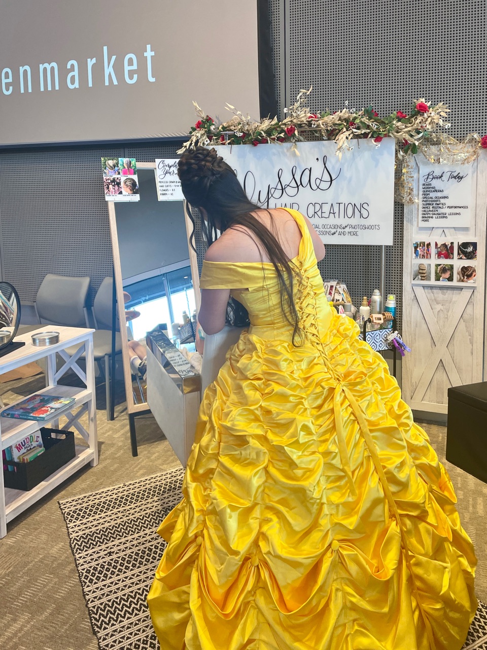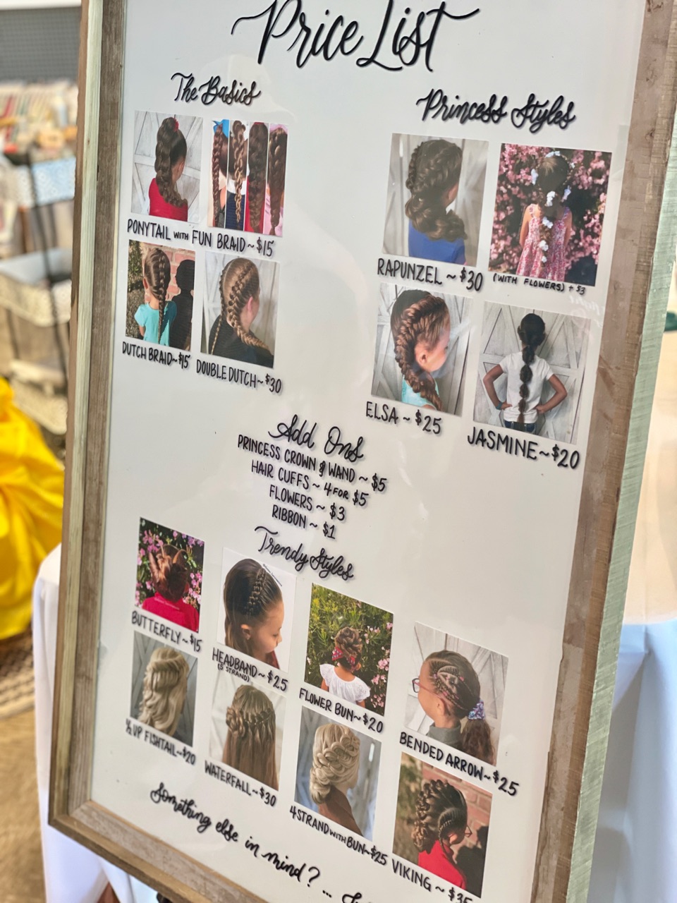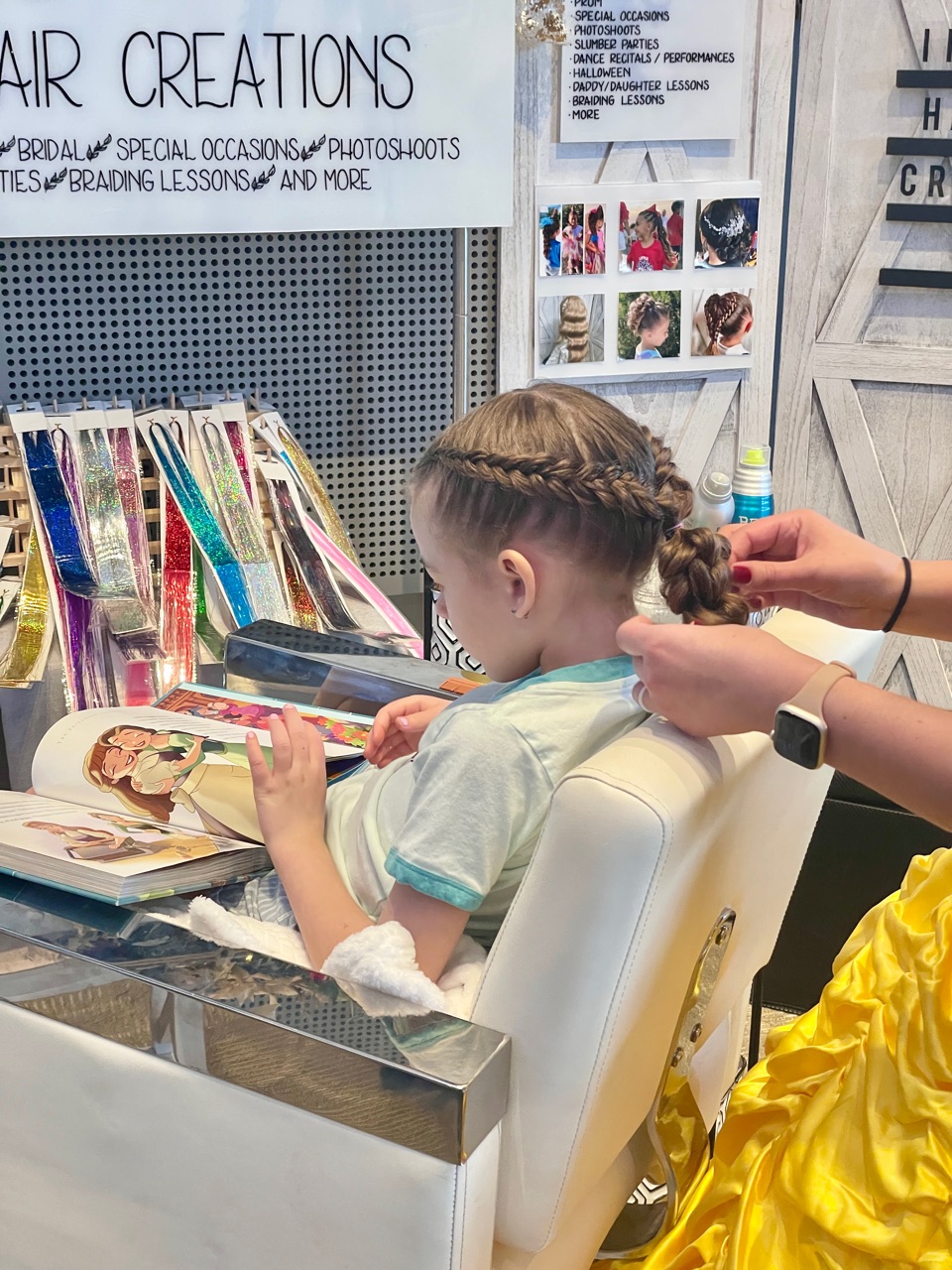 エルサやジャスミン、プリンセススタイルなどなど、色々な髪型を$15〜やってくれるんです。