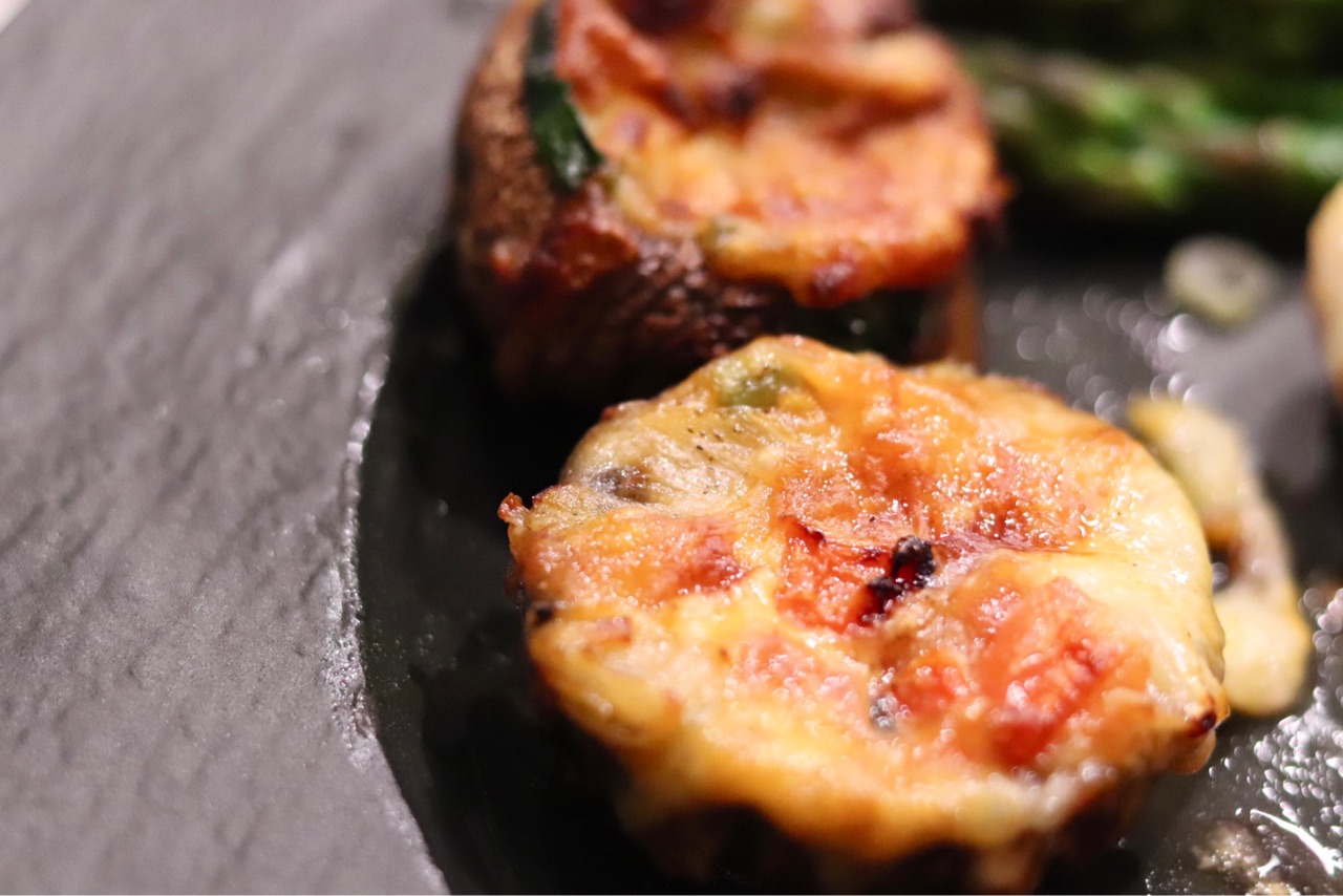 Stuffed Shiitakeは、椎茸の上にチーズとベルペッパーを置いて、オイルでスプレーし、エアフライヤー(日本ではノンフライヤー)で7分程焼いただけ↓