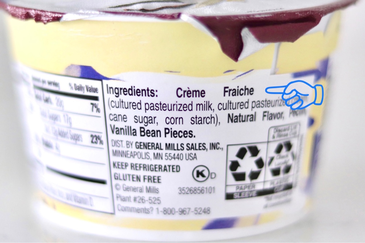 通常のヨーグルトの商品には、Pasteurized MilkとかYogurt Culturesと書かれているものが多く、Crème Fraîcheとは書かれていません。