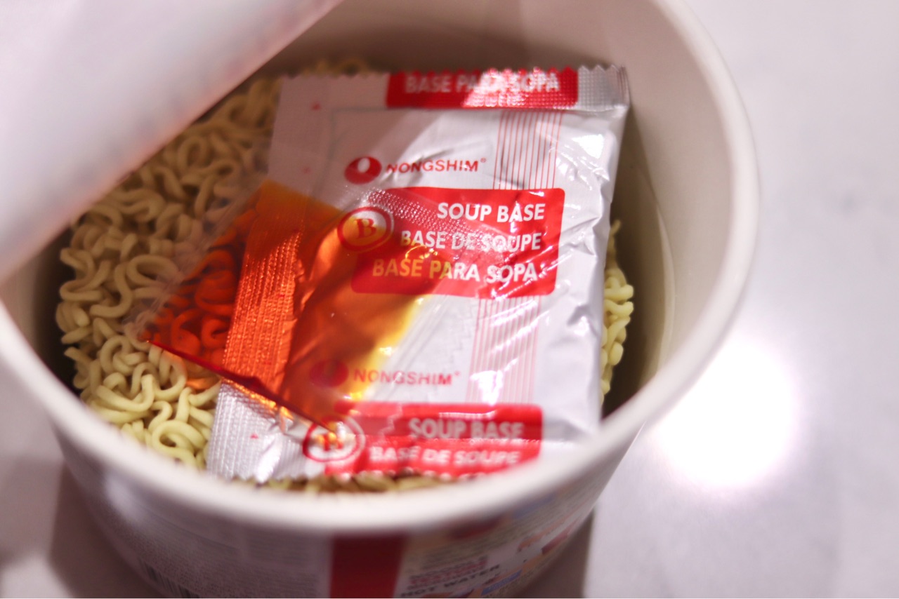 日本のカップラーメンは”かやく”入りのパックも入っているかと思いますが、かやくは直に入っています(底に埋まってました)。