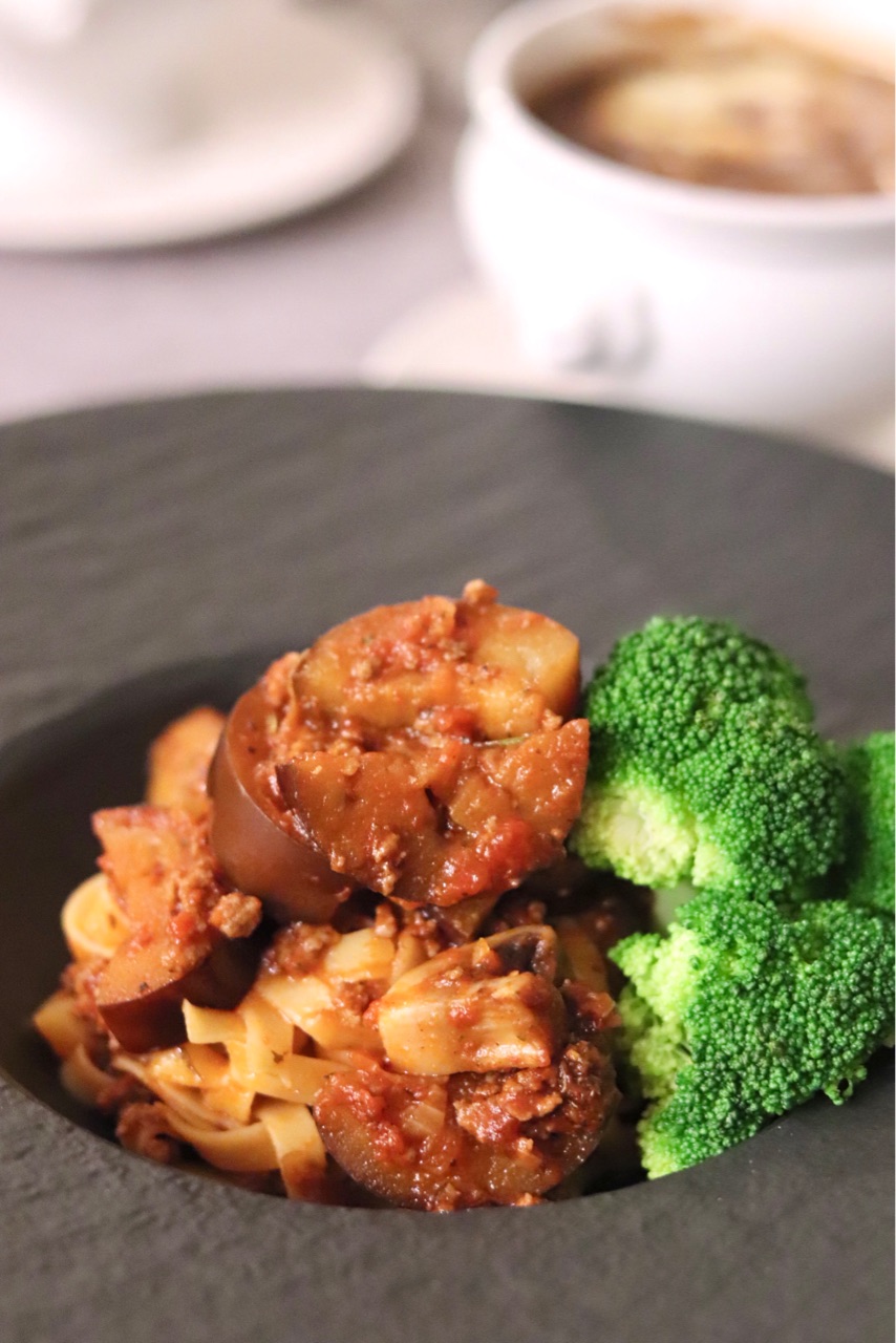 この日は、スープと一緒に茄子と挽肉のトマトソースパスタをいただきました🍝