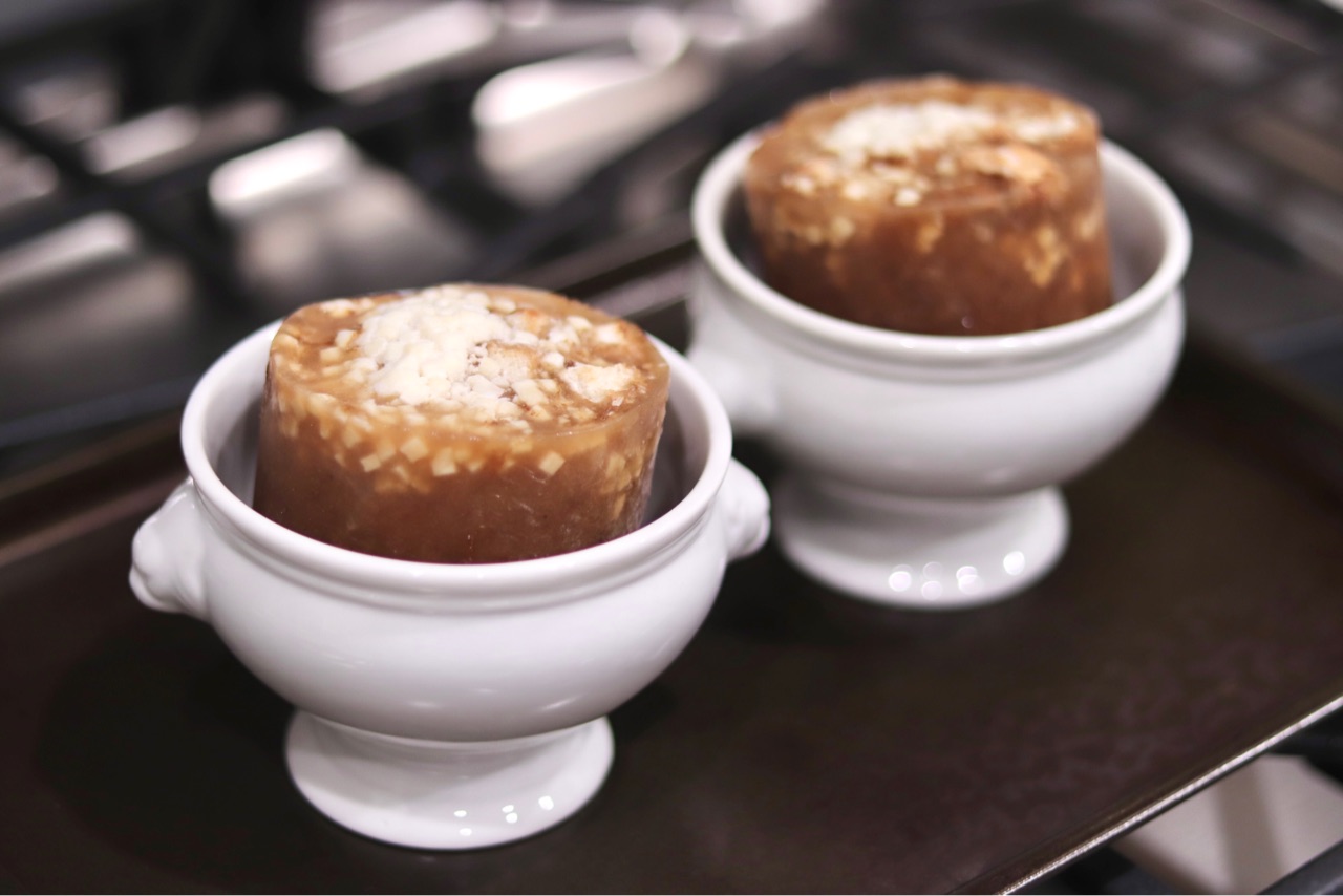 スープカップと冷凍フレンチオニオンスープの高さがあったためオーブン中央に置いたら、オーブンの天井に到達してしまいました...笑