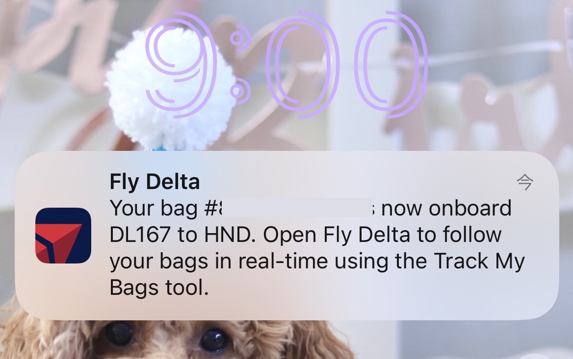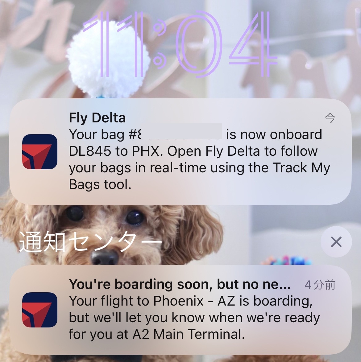 アメリカに帰る際も、アメリカ入国後の飛行機の乗り換え後に再度スーツケースをカウンターにドロップした後も、自動的に”お知らせ”がスマホに来るので、ロストバゲージしてるかも?という不安な思いは一切なし!