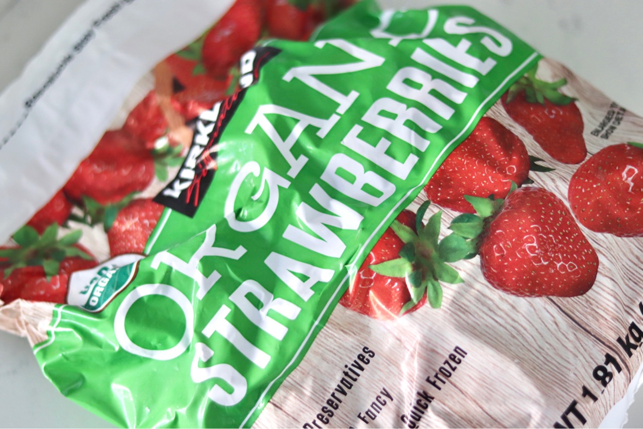 Kirklandから販売されている、冷凍オーガニックストロベリー($10.79)↓